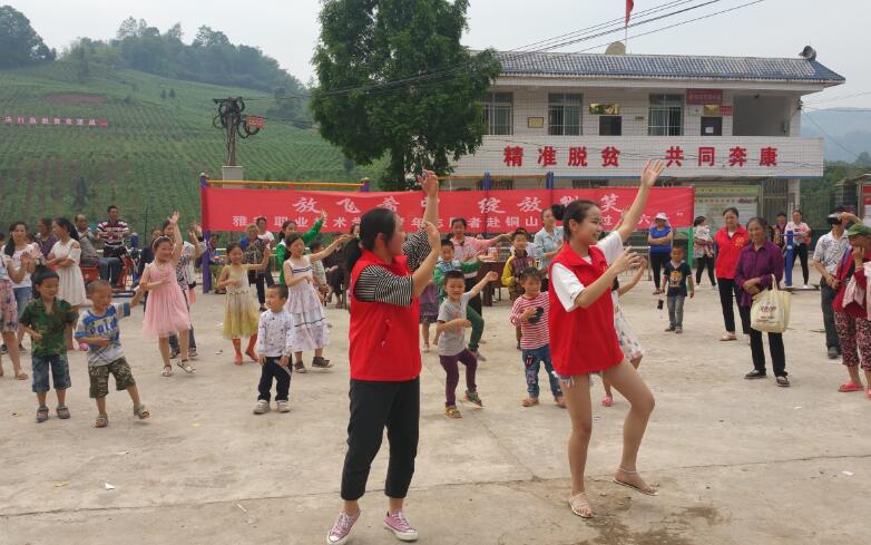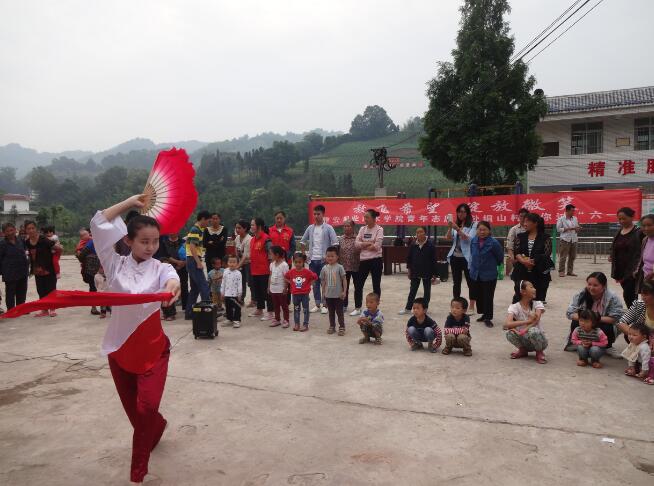 上午9:30,志愿者们一行到达铜山村文化院坝,随即与村两委干部快速布置好会场,现场陆续已有60余名4-14岁的儿童在家长陪同下一起在院坝中等候,其中有不少是留守儿童。教育系女生以一段优美的民族舞独舞《舞美家乡》拉开了序幕,孩子们都沉醉于这优美的舞姿中。之后志愿者们依次组织孩子们做了红黄牌、桃花朵朵开、成语接龙、左右脚等小游戏,小朋友们热情高涨,积极参与到游戏之中。随后院团委王昌宇老师给大家献唱了民歌《欢聚一堂》,赢得观众阵阵热烈的掌声。在欢乐融洽的气氛中,志愿者们又教小朋友们跳起了《小苹果》广场舞,随着欢快的音乐、动感的节奏,小朋友们一起加入到集体舞中,既锻炼了身体又愉悦了心情。最后,志愿者们协助村委干部依次给小朋友们分发了文具用品,旨在鼓励他们从小树立努力学习的观念。