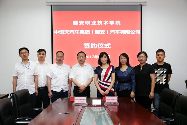 【本网讯】6月1日,学院与中恒天汽车集团(雅安)汽车有限公司签署校企合作协议。中恒天汽车集团(雅安)汽车有限公司总经理彭福生一行5人,学院院长石静、党委副书记付洪涛、机电系主任王梅、副主任吕波等出席签署仪式。