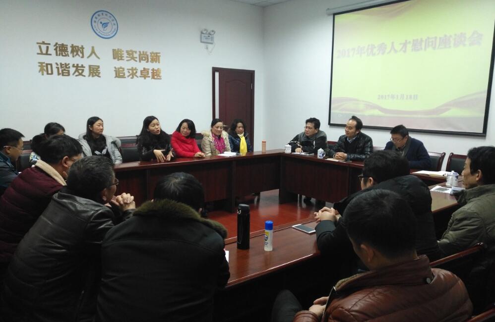 【本网讯】1月18日,我院召开2017年春节前优秀人才代表慰问座谈会,党委书记张大凯,党委委员、纪委书记谭宏,党委委员、副院长樊先茂,党委委员、成培处处长宋立智和组织部长、人事处处长夏安琼在育才路校区B210会议室集中慰问21名来自教学、医疗、管理、后勤服务一线及勇挑灾后重建、精准扶贫急难险重任务并成绩突出的优秀人才和党外知识分子代表。