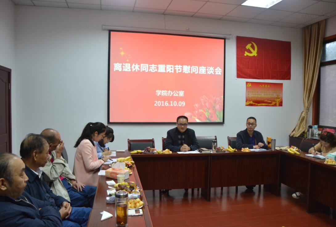 【本网讯】10月9日下午,党政办公室在育才路校区B210会议室召开离退休同志重阳节座谈会,对离退休老同志进行慰问。党委书记张大凯,副院长樊先茂,办公室副主任江成鹏、王悦秋,图书馆副馆长文艺及10名离退休老干部代表参加了座谈会。