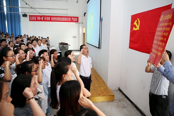 当全体参会人员一起唱响国歌,庆祝大会正式开始。在学院党委书记张大凯的带领下,40名新党员代表进行了庄严的入党宣誓,全体党员重温了入党誓词。