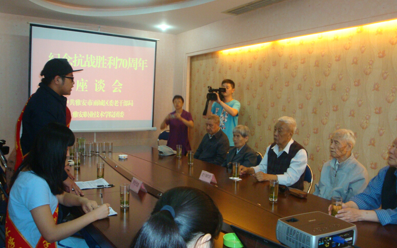 【本网讯】9月2日上午,为纪念抗战胜利暨世界反法西斯战争胜利70周年,我院团委与雅安市雨城区老干部局共同举办了“我与英雄面对面,聆听红军故事,传承抗战精神”纪念抗战胜利70周年座谈会。雨城区老干部局局长伍文利、郭莉,院团委书记高运荣,2名团委老师和7名青年学生志愿者与5位抗战时期的老干部参加此次座谈会。