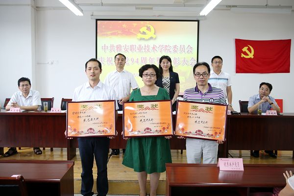 【本网讯】6月30日下午,学院党政班子成员、在职教职工党员代表、离退休党员代表、新党员代表90余人佩戴着党徽,在青年路校区图书综合楼903会议室隆重集会,庆祝建党94周年,共同缅怀党的光荣历史,弘扬党的优良传统,并通过新党员宣誓、老党员重温誓词、表彰先进党员等活动,进一步加强党员党性修养,践行 “三严三实”要求,坚定理想信念,夯实贯彻落实“四个全面”战略的思想基础,以推动学院建设发展。党委副书记、院长石静主持大会。
