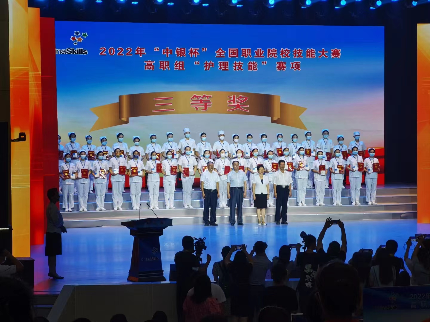 8月18日至21日,2022年全国职业院校技能大赛(高职组)护理技能大赛在莱芜职业技术学院举行,来自全国68所高校的136位选手参加了此次大赛,由我校护理学院教师黄蕾、王菠指导,学生杨陆璐、李诗怡参赛的团队荣获该赛项三等奖。