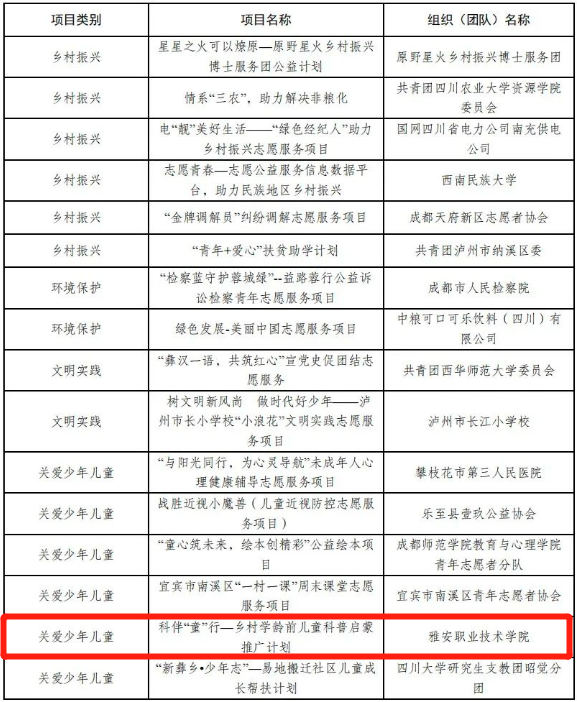 9月23日,第六届中国青年志愿服务项目大赛四川省赛获奖名单公布。我院临床医学院“益医优康-绿丝带互联网+慢性病医疗志愿服务项目”荣获为老服务类金奖。院团委“科伴童行-乡村学龄前儿童科普启蒙推广计划”荣获关爱少年儿童类铜奖,并代表四川省参加第六届中国青年志愿服务项目全国赛。