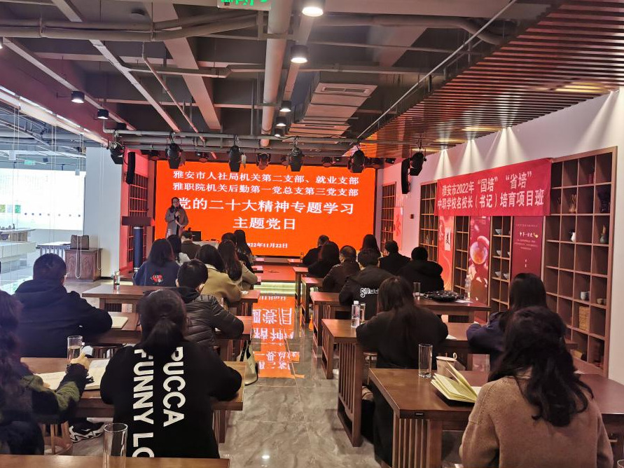 11月22日下午,学院机关后勤第一党总支第三支部与雅安市人力资源和社会保障局机关委员会第二党支部、雅安市就业创业促进中心党支部联合开展了“人社进校园 联建促发展——党的二十大精神专题学习”主题党日活动,活动在学院青年路校区茶创空间举行,学院党委副书记付洪涛以普通党员身份参加活动,共30余名党员同志参加本次活动。