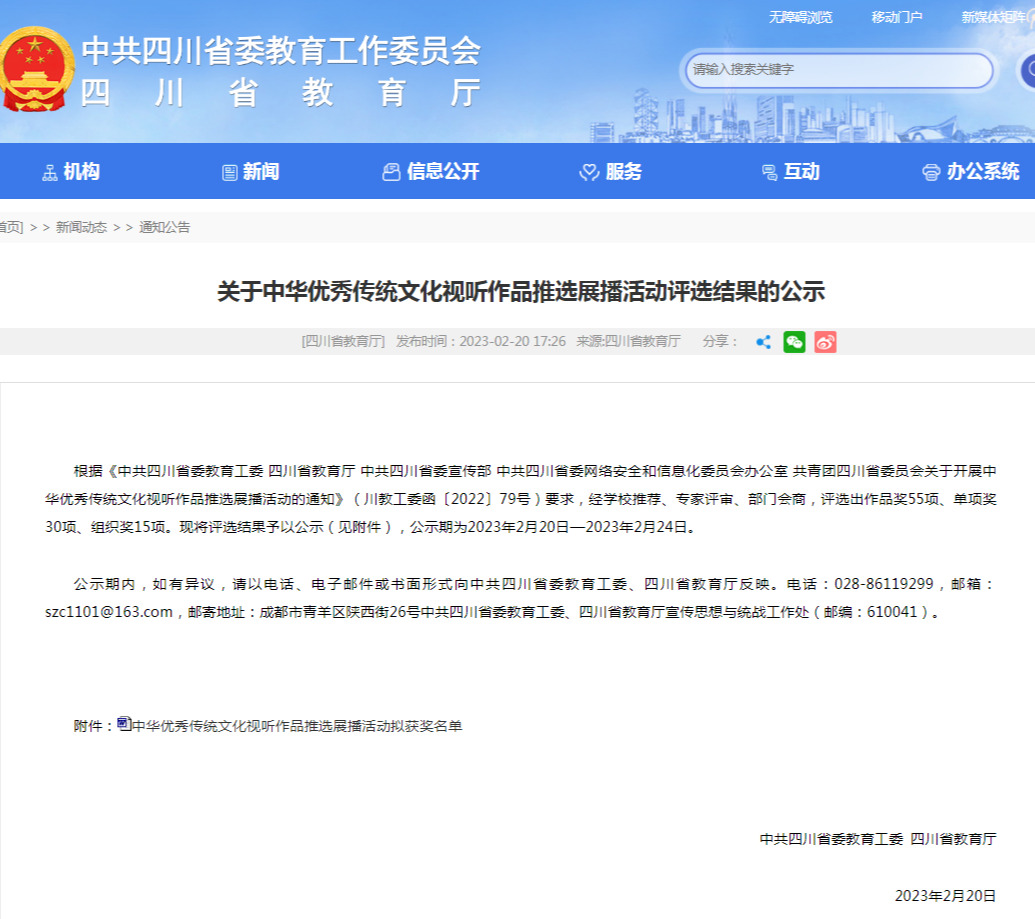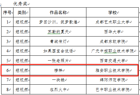 近日,中共四川省委教育工委、四川省教育厅对中华优秀传统文化视听作品推选展播活动评选结果进行了公示,学院拍摄的短视频《榜样》获优秀奖。