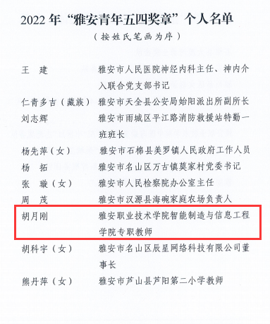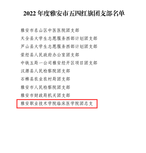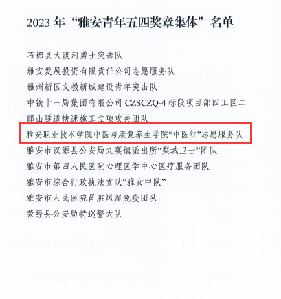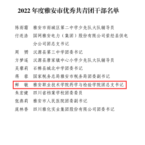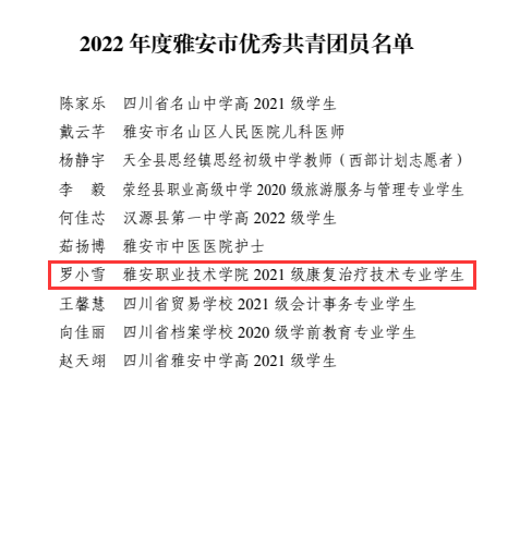 智能制造与信息工程学院教师胡月刚荣获“雅安青年五四奖章”个人;中医与康复养生学院“中医红”志愿服务队荣获“雅安青年五四奖章”集体;临床医学院团总支荣获雅安市五四红旗团支部称号;药学与检验学院团总支书记鲜敏荣获雅安市优秀共青团干部称号;中医与康复养生学院2021级康复治疗技术专业学生罗小雪荣获雅安市优秀共青团员称号。