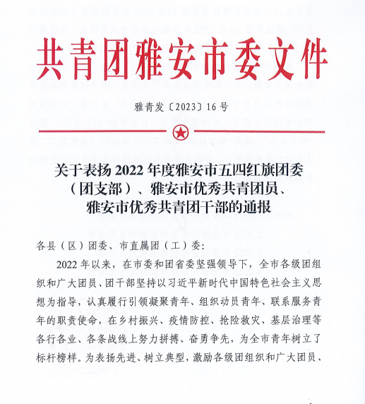 近日,共青团雅安市委发布了《关于表扬2023年“雅安青年五四奖章”个人和集体的通报》和《关于表扬2022年度雅安市五四红旗团委(团支部)、雅安市优秀共青团员、雅安市优秀共青团干部的通报》。