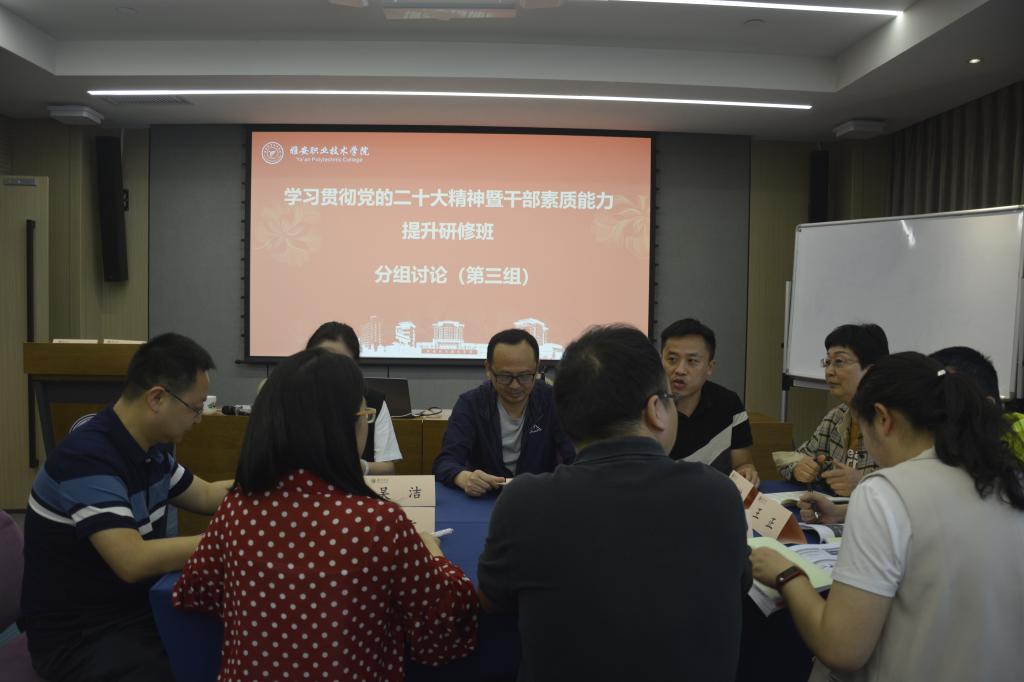 在学习交流汇报环节,党委委员、副院长张军,工会主席夏安琼及其他3位学员代表分享了心得体会,表示5天的培训受益匪浅,要将本次培训学习的收获与实际工作结合起来、与学校治理能力提升工作结合起来,围绕立德树人根本任务,发挥领导干部模范带头作用,努力提高自身的政治素养、知识水平、业务素质和管理能力,为推进学院高质量发展贡献力量。4位组长分别汇报了各组交流讨论情况,大家认为本次培训方案周密,学习内容充实;主讲嘉宾报告精彩,为学院高质量发展提供了有益指导;全体干部精神状态好,主题发言准备充分,符合学校当前实际和未来发展需要;学习调研丰富多彩,进一步拓宽了大家的视野,有效提升了学院人才培养质量、治理水平、师德师风建设。