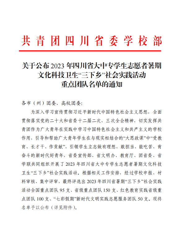 近日,共青团四川省委学校部公布2023 年四川省大中专学生志愿者暑期文化科技卫生“三下乡”社会实践活动重点团队名单。学院“承新承艺”地方特色传统文化传承创新实践团入选全国重点团队,高原绿——高原地区意外伤害急救科普团队入选省级重点团队。