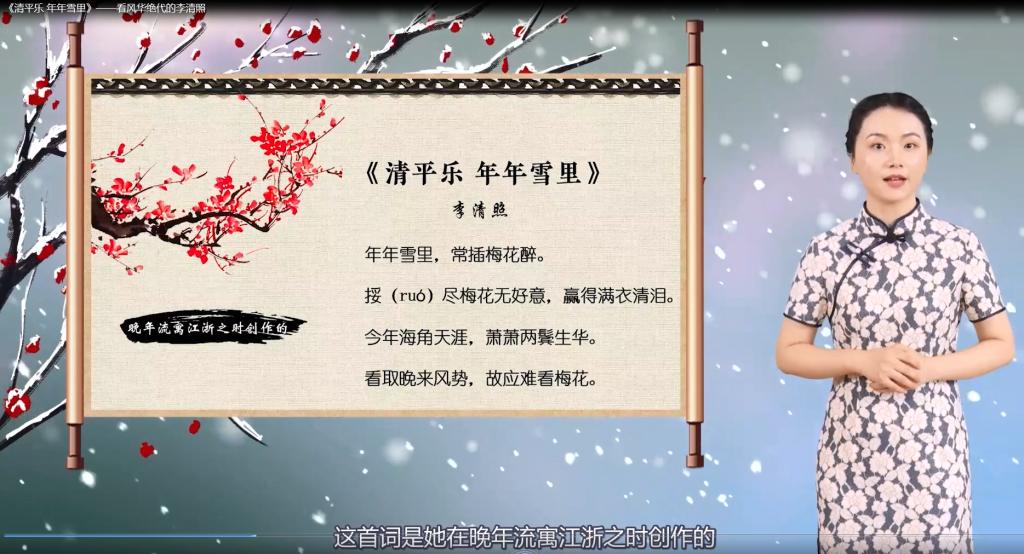 夏椰柯讲解的《清平乐•年年雪里》是宋代女词人李清照创作的一首赏梅词,也是词人对自己一生早、中、晚三期带有总结性的追忆之作。全词以赏梅寄寓自己的飘零之情和家国之恨,词意含蓄蕴藉,感情悲切哀婉,呈现出历经忧患、备受折磨,仍自尊自强、敢爱敢恨、忠贞爱国的女性形象。