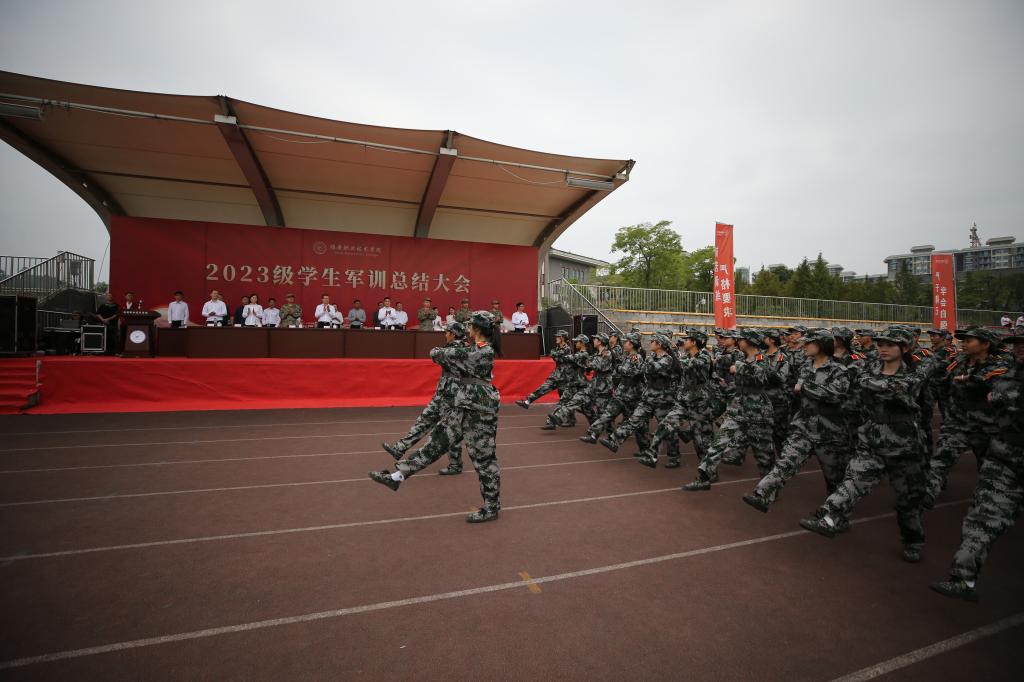 校园书声琅,操场秋点兵,学院2023级新生为期14天的军事技能训练顺利完成。9月28日,2023级新生军训总结大会在经开区校区和青年路校区同步举行。学院党委书记李春模,党委副书记、院长黄诚,雅安军分区大校司令员梅旭东出席大会,两校区总结大会分别由学生处处长徐维、副处长陈淼玲主持。