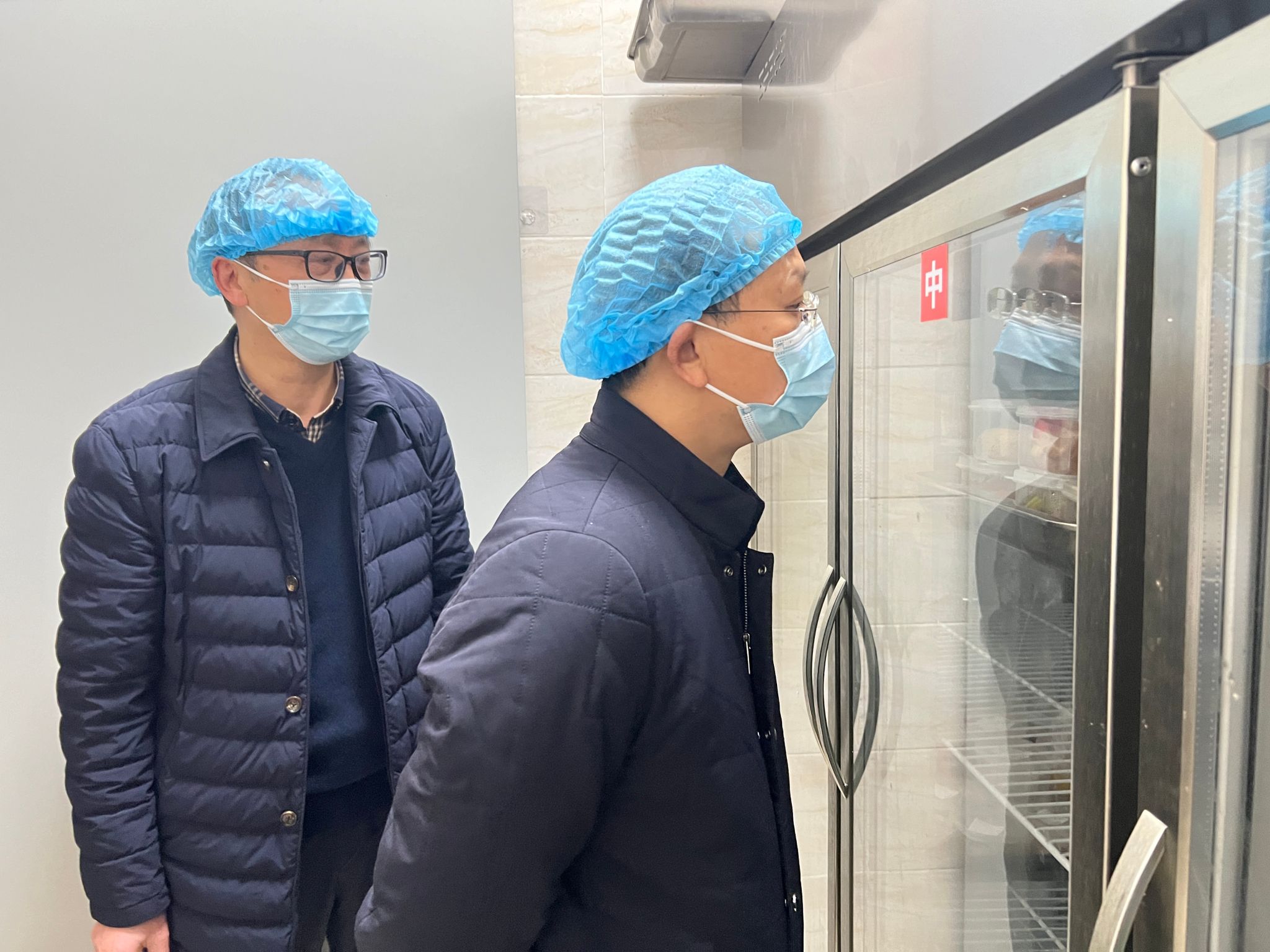 张军向邓朝金一行介绍了近期学院食品安全工作情况。邓朝金一行实地查看学院食堂厨房操作区、库房、售卖区等地,详细了解学院“两个责任”落实情况。