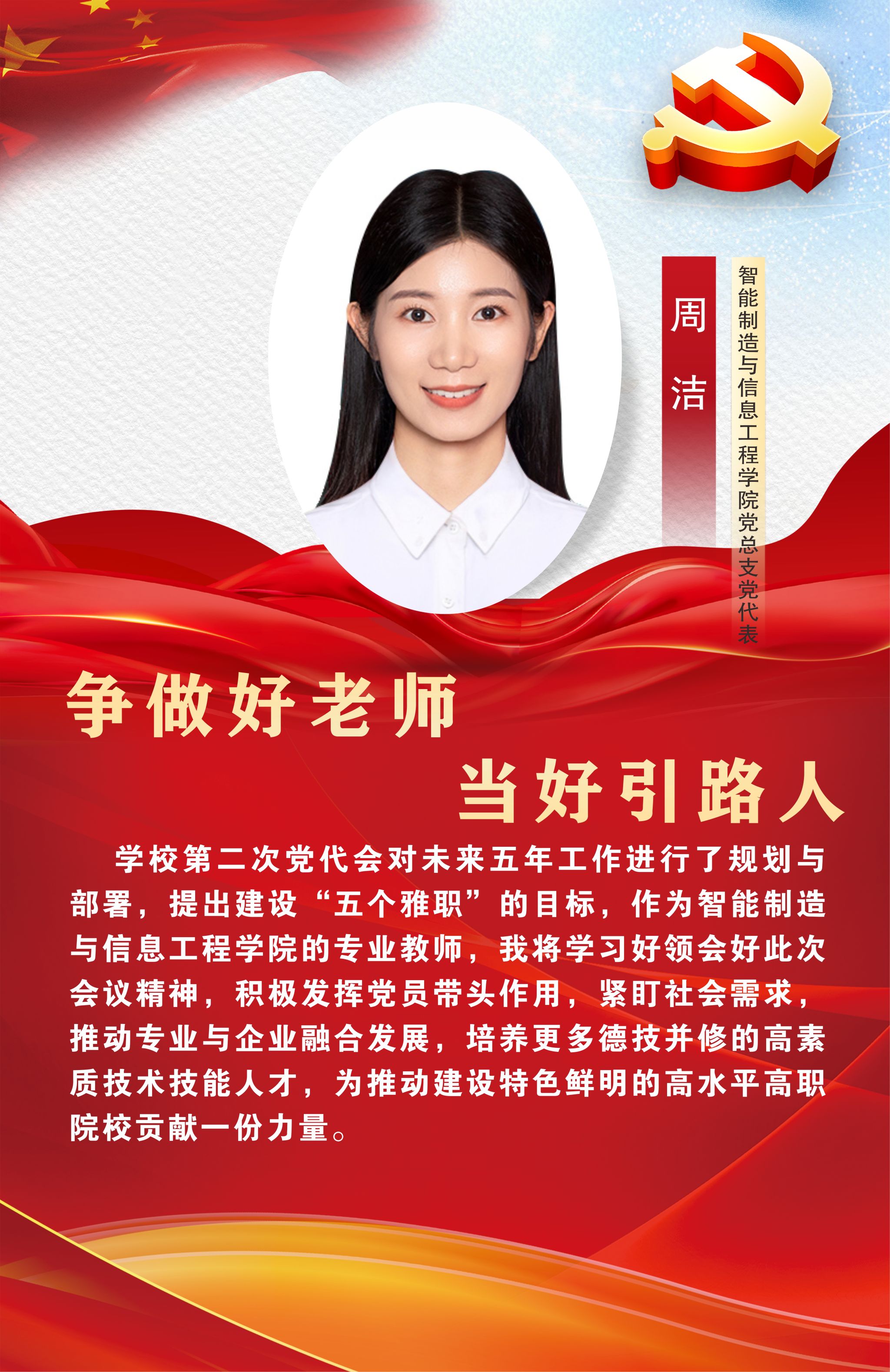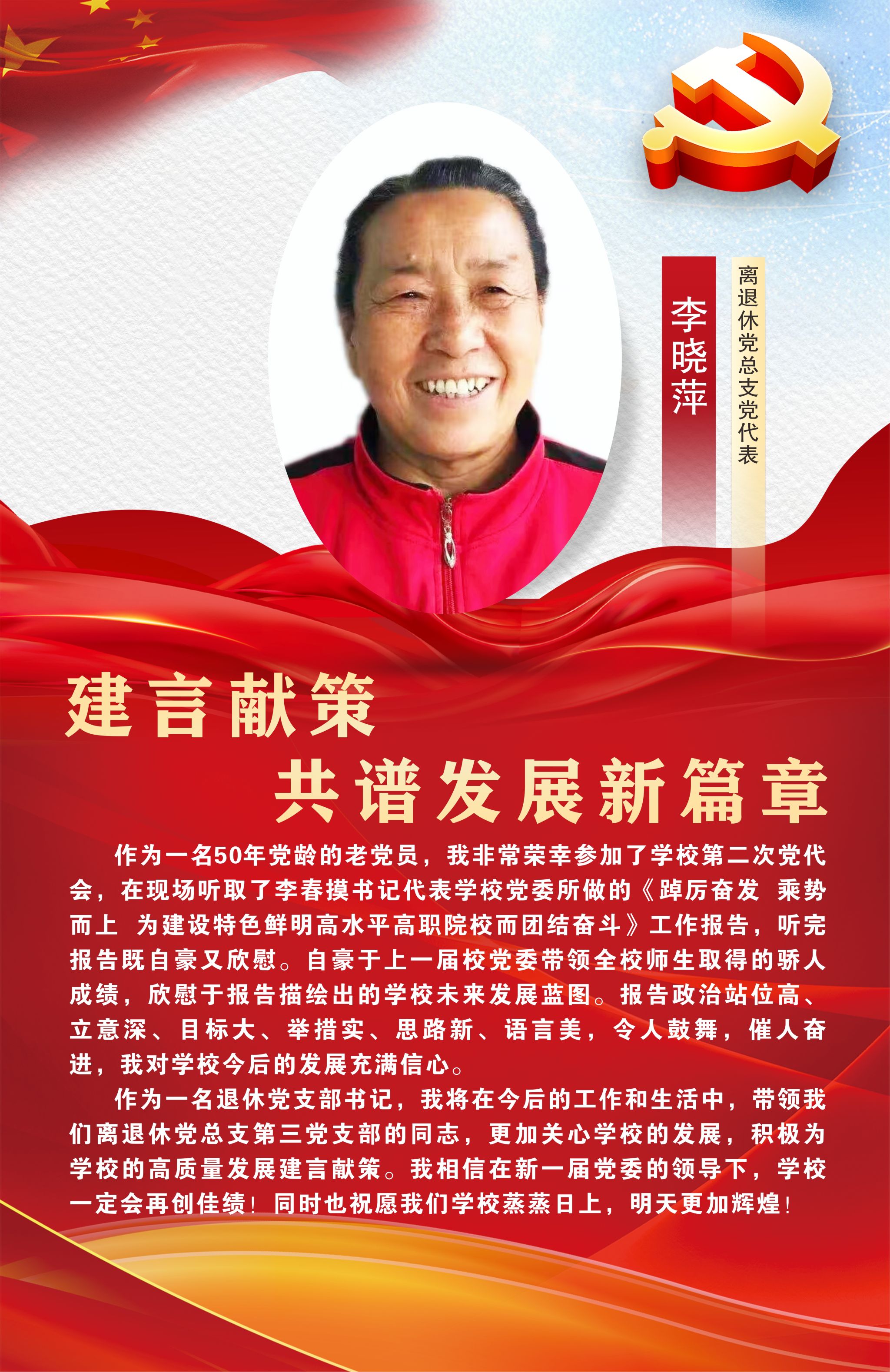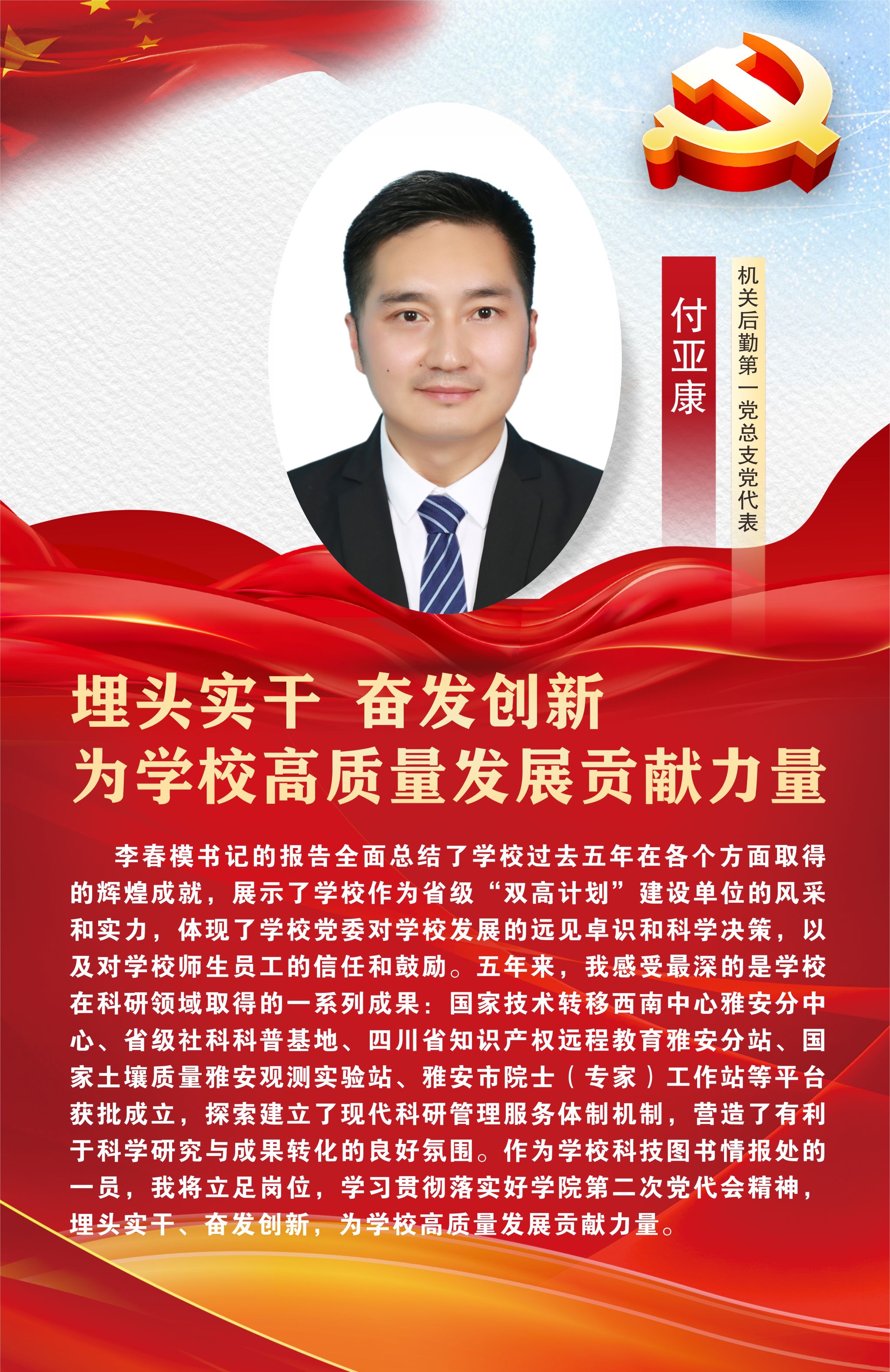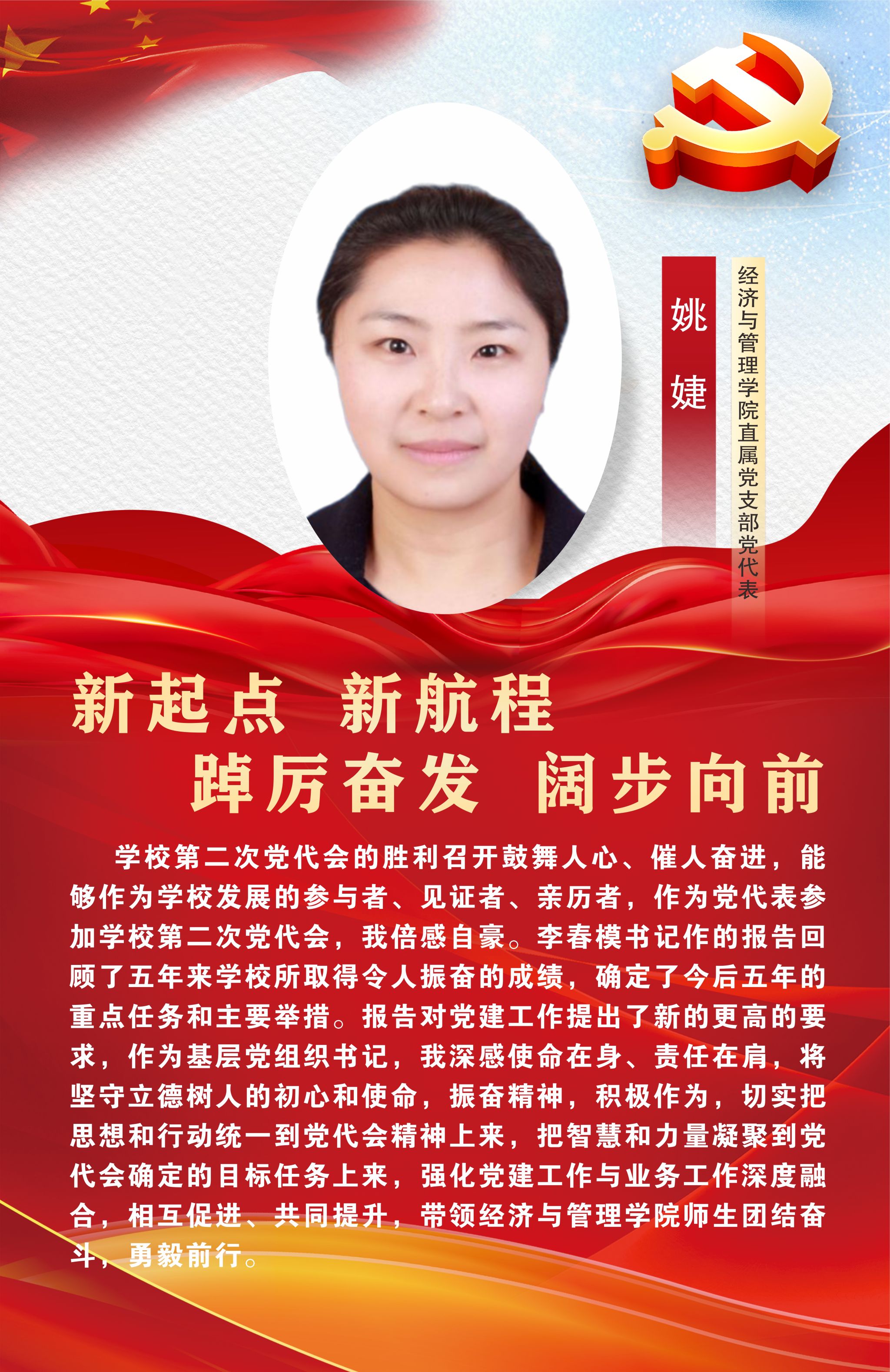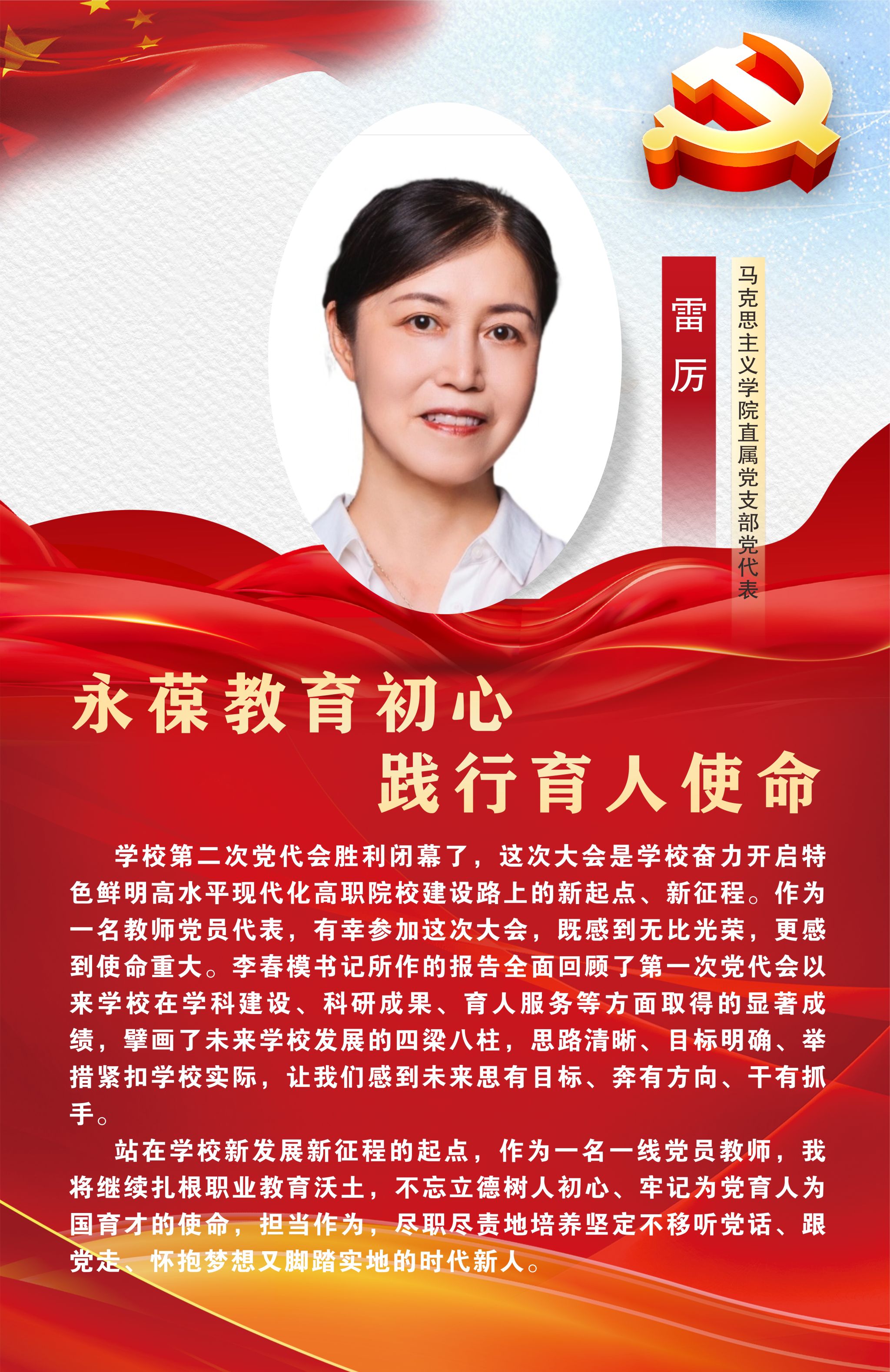 12月29日,中国共产党Beat365唯一官方网站第二次党员代表大会在经开区校区聚雅厅胜利闭幕。此次大会对学校未来发展建设有着谋篇布局、举旗定向的关键作用,是全校师生政治生活中的一件大事。让我们高举中国特色社会主义伟大旗帜,以习近平新时代中国特色社会主义思想为指导,坚持立德树人根本任务,坚守为党育人、为国育才初心使命,始终心怀“国之大者”“省之大计”“市之大事”,坚定信心,同心同德,以时不我待只争朝夕的精神状态,踔厉奋发、乘势而上,为建设特色鲜明高水平高职院校而团结奋斗,在以中国式现代化引领职业教育高质量发展的征程中贡献雅职力量。