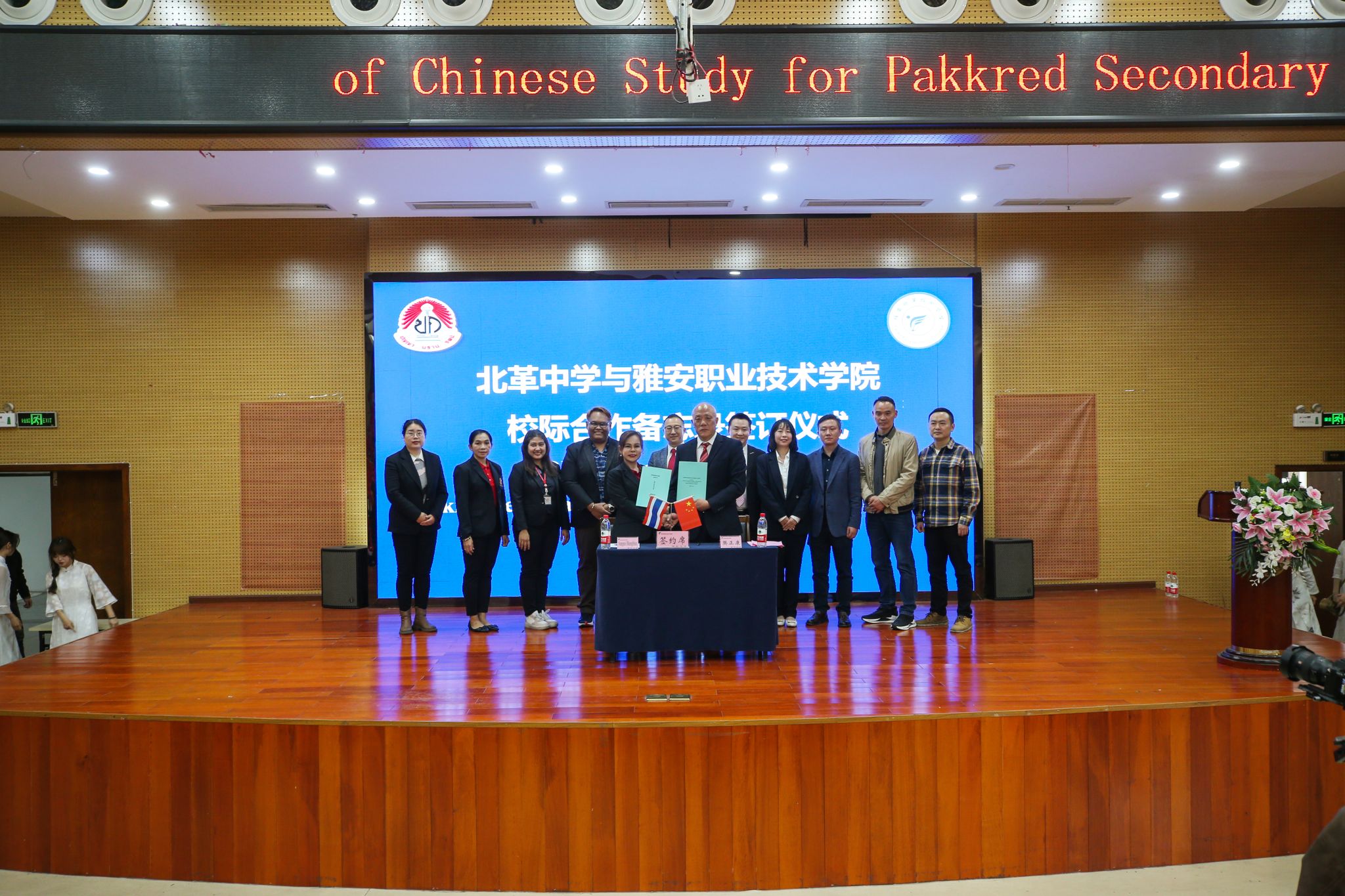 仪式上,学校与暖武里府北革中学签订了校际合作谅解备忘录,并播放了研学视频,双方互赠了外事礼物。樊正康为泰国校长和老师颁发了培训证书,蔡鹏和学校相关二级学院负责人则为泰国同学们颁发了结业证书。