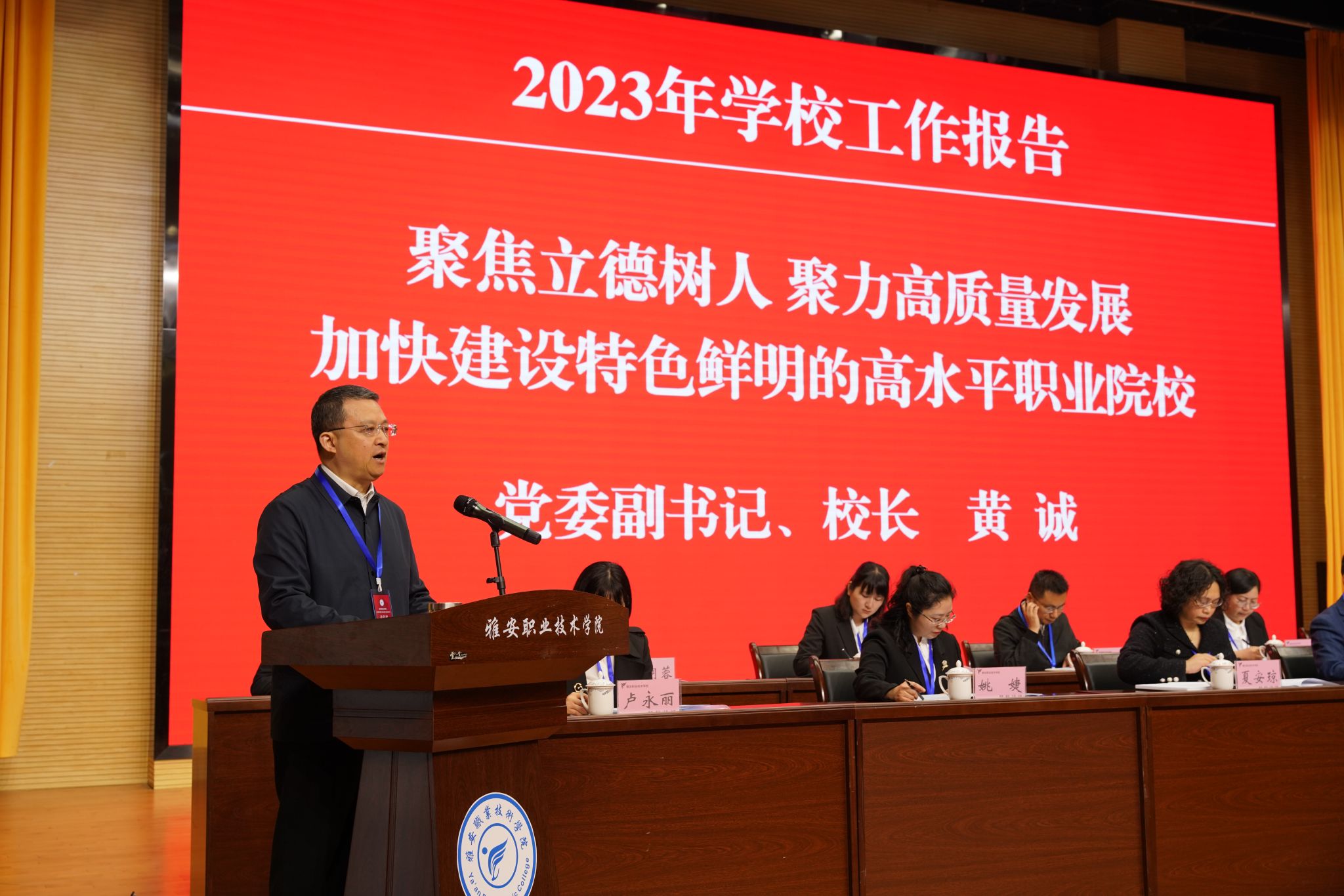 黄诚向大会作了题为《聚焦立德树人 聚力高质量发展 加快建设特色鲜明的高水平职业院校》的工作报告。从坚守政治方向,深化主题教育,持续加强党对教育工作的全面领导;聚焦职教重点,提升办学质量,服务经济社会发展的能力不断增强;遵循教育规律,优化治理体系,确保学校安全稳定和持续发展三个方面回顾了2023年学校牢牢把握教育的政治属性、战略属性、民生属性,以推进高水平职业院校项目建设为抓手,落实立德树人根本任务,聚焦提升办学质量和服务能力、优化内部治理体系等职业教育改革重点以推动各项事业发展所取得的成绩,客观分析了发展面临的机遇和挑战、存在的问题和短板。并结合第二次党代会精神和本年度重点工作,以工作创新年为切入,以落实《四川省职业教育条例》、扎实推进“双高”建设为主线,以打造更多标志性成果为主攻方向,以持续深化教育教学综合改革为根本动力,对今年工作从强化思想政治引领、立德树人根本任务、干部人才队伍建设等七个方面进行了全面部署。