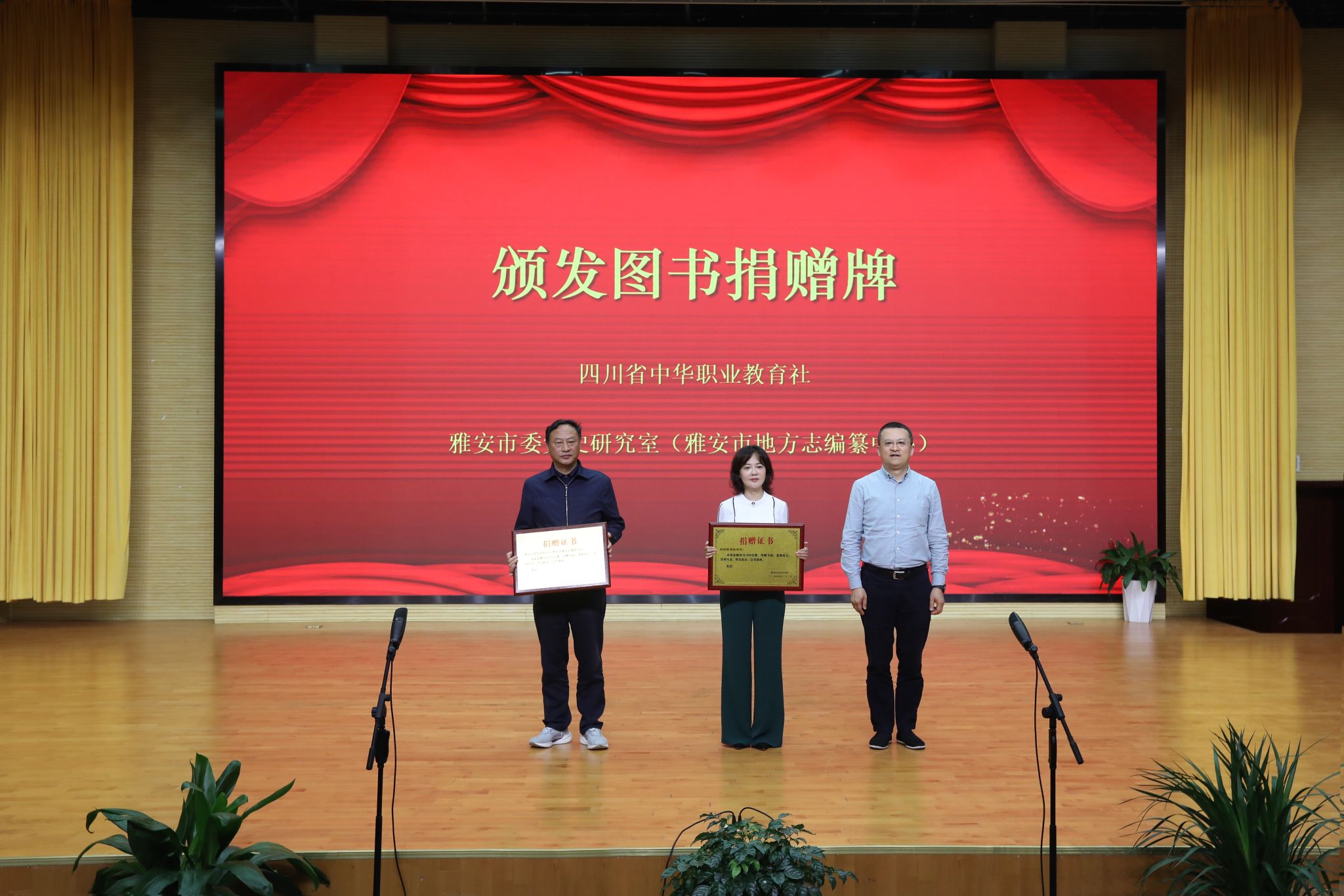 黄诚为四川省中华职业教育社、雅安市委党史研究室(雅安市地方志编纂中心)两家单位颁发了图书捐赠牌,并宣布学生素质能力提升活动周暨第二届读书文化节正式启动。