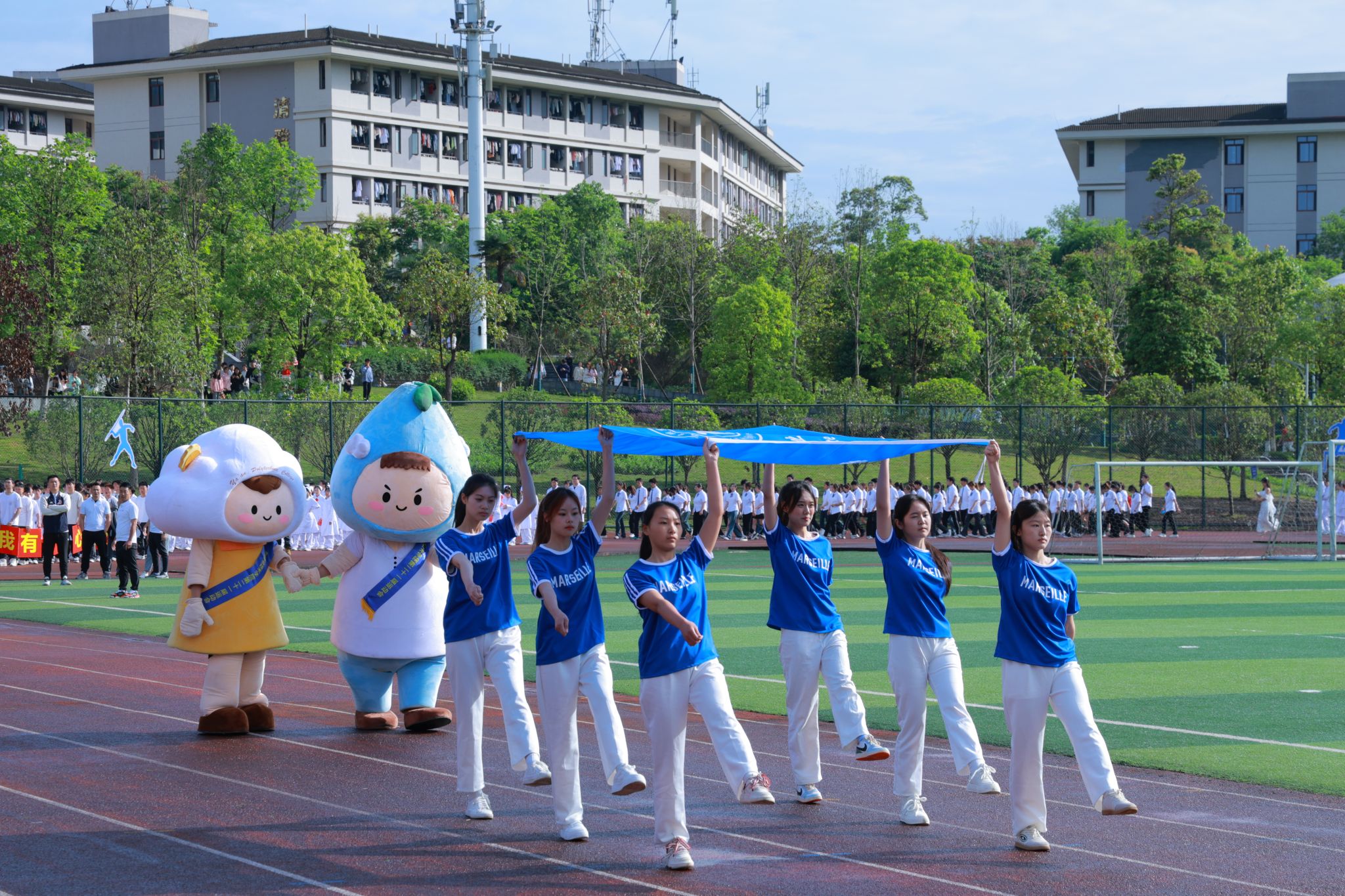 夏安琼宣布运动会正式开幕的话音刚落,现场彩球纷飞、礼乐齐鸣,彩旗队、啦啦操、学生大型团体操、教职工八段锦表演轮番上阵,青春的活力与激情在运动场上尽情绽放,气氛瞬间达到高潮。