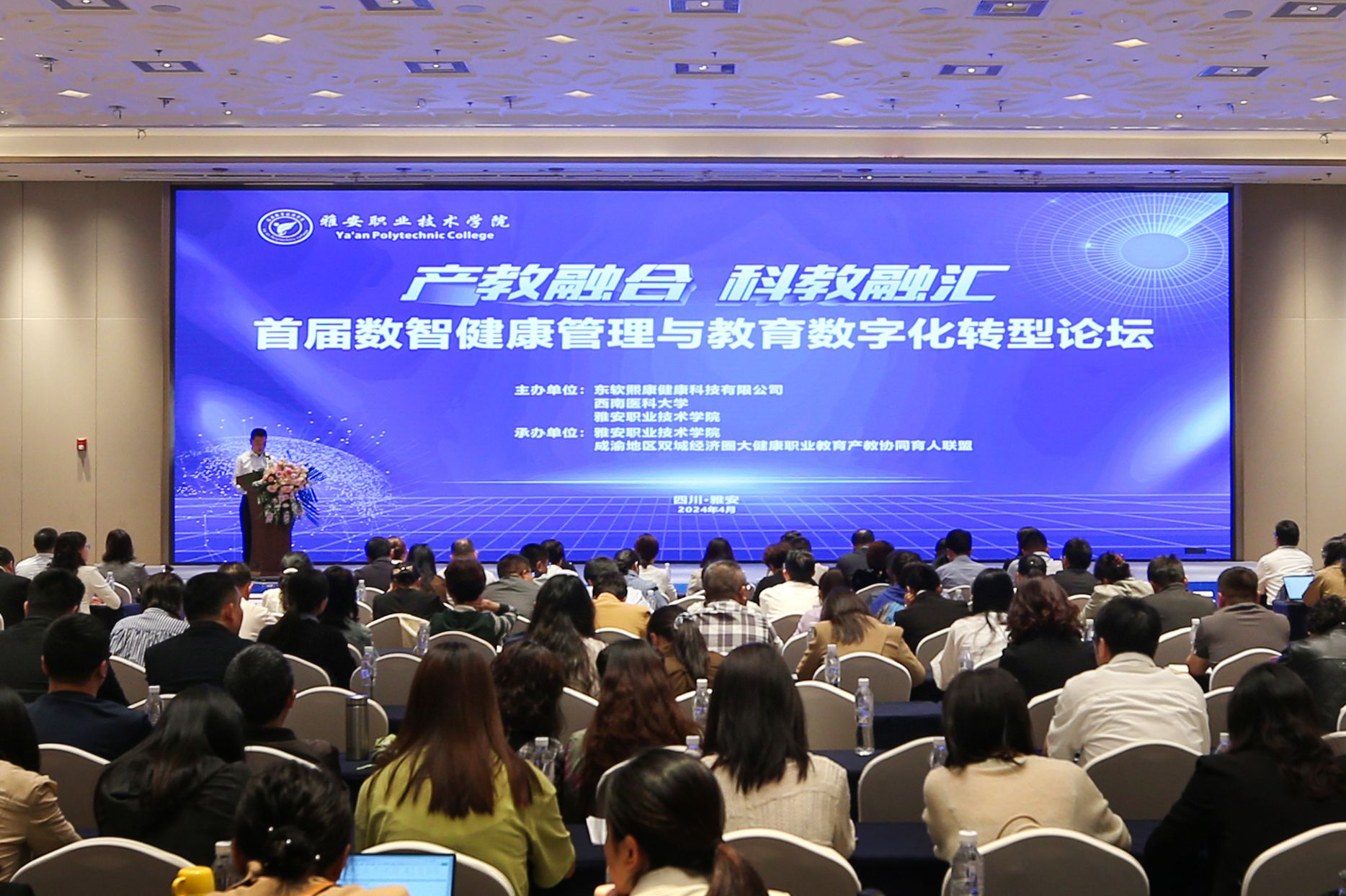 4月28日,由学校和东软熙康健康科技有限公司、西南医科大学共同牵头举办的数智健康管理产教融合共同体成立大会暨首届数智健康管理与教育数字化转型论坛在雅安隆重召开,来自全国医学界和教育界的300余位嘉宾参会。学校党委书记李春模、西南医科大学医学信息与工程学院院长罗亚梅、东软熙康集团高级副总裁杨元蔚出席会议并致辞。大会由学校党委副书记、校长黄诚主持。