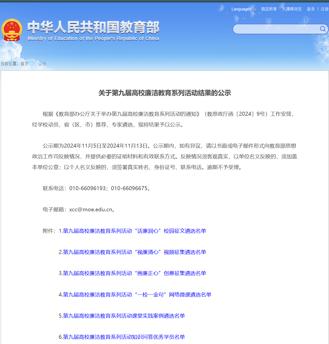 近日,由我校马克思主义学院制作、学校纪委选送的作品《让孝廉之风薪火相传》进入教育部组织的第九届高校廉洁教育系列活动之“一校一金句”网络微课公示名单。据悉,我校是全省网络微课入选的9所高校中的唯一一所高职院校。这是我校首个入选国家级项目的廉洁微课,更是学校全面从严治党、全面从严治校,扎实推动廉洁教育的标志性成果!