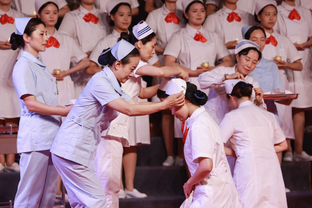 传光授帽仪式将整个活动推向高潮。黄丽琼、王青力、王成英、许玉贤、王静、陈俊六位护理领域的优秀前辈为学生代表郑重地戴上象征着护理职业荣誉与责任的燕尾帽,寓意着生命之光的烛蜡在前辈们手中依次点亮,传递着护理精神的火种。学生们庄重地举起右手宣誓,热爱护理事业,遵守护士的职业道德,一切以患者为中心,永葆白衣天使的圣洁。伴随着全场齐声合唱《让世界充满爱》,晚会在温馨、优美的旋律与温暖感人的氛围中圆满落下帷幕。