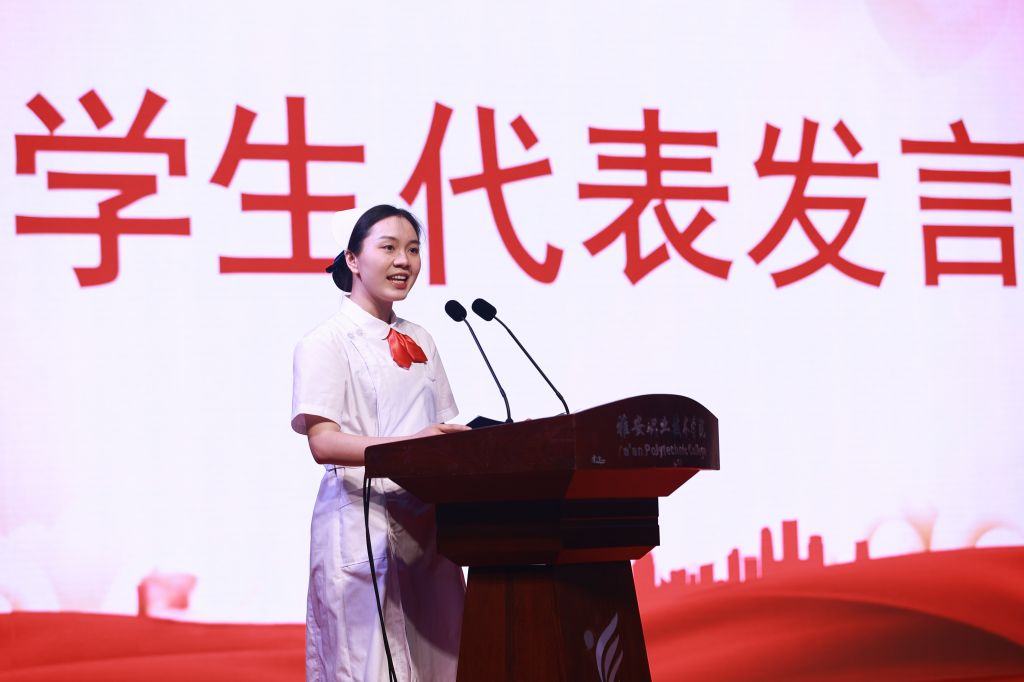 2024年世界职业院校技能大赛总决赛争夺赛护理技能大赛银奖得主杨梦作为优秀学生代表发言。她深情回顾了自己的学习、参赛以及备赛历程,分享了其中的挑战与收获。她表示,这段宝贵的成长经历使自己更加坚定了在护理道路上前行的决心,将以更专业的知识和更热忱的心守护生命健康,不辜负学校的培养与期望。