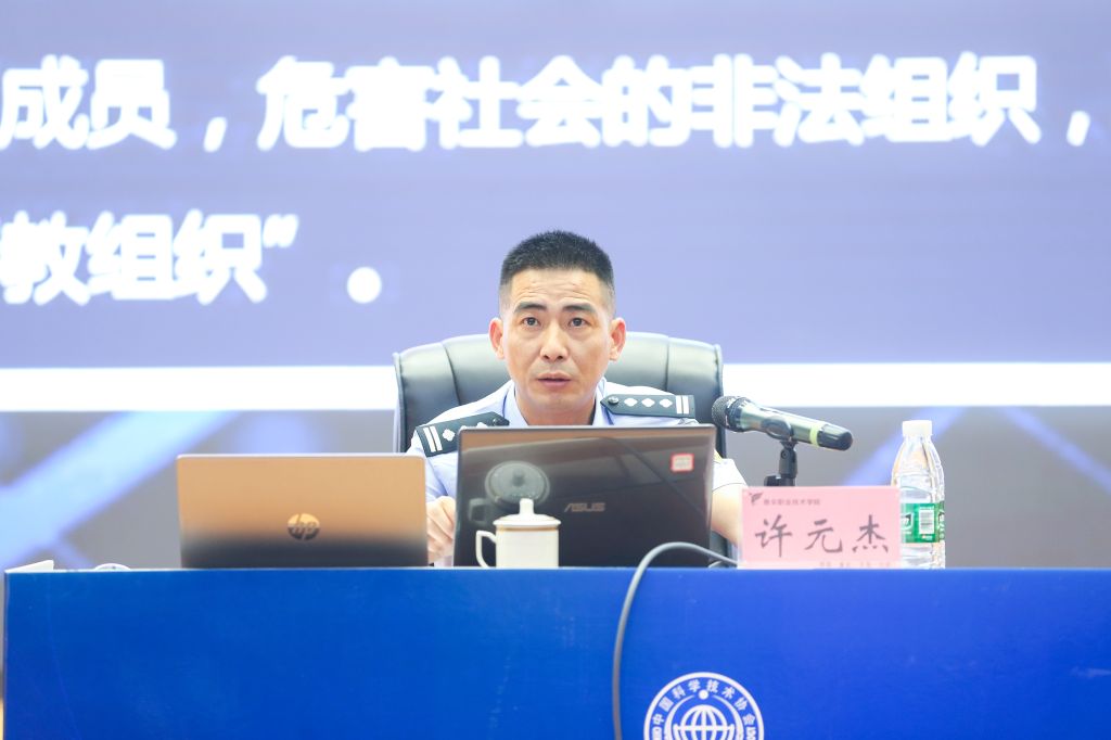 活动中,乐山市公安局政保支队反邪教大队大队长、一级警长许元杰警长为师生们带来了一场内容详实、形式生动的反邪教专题讲座。许元杰围绕 “什么是邪教、邪教的类型、面对邪教该怎么办”三个方面展开深入讲解,通过列举真实案例、分析邪教手段,深入浅出地剖析了邪教的本质及其对个人、家庭和社会的巨大危害,为师生们上了一堂极具警示意义的教育课。