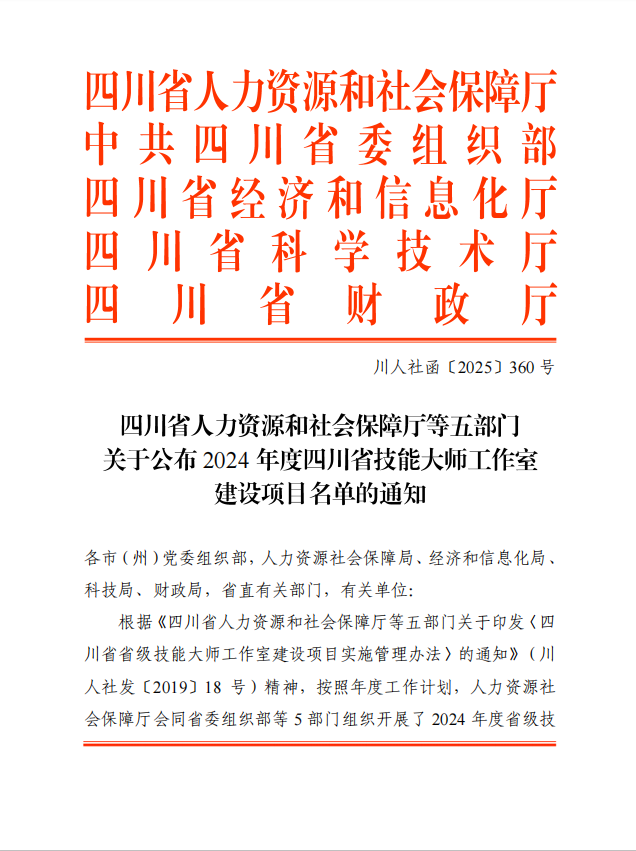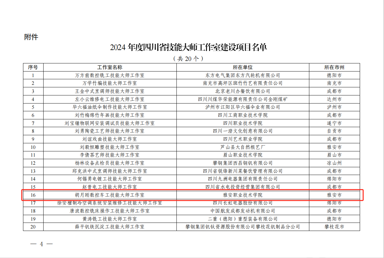 近日,四川省人力资源和社会保障厅等五部门联合发文公布了2024年度四川省技能大师工作室建设项目名单,我校“胡月刚数控车工技能大师工作室”榜上有名,成为该年度20个省级技能大师工作室建设项目之一。