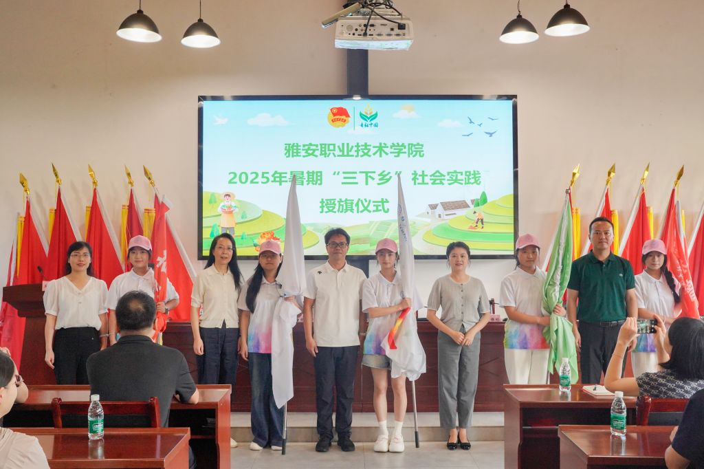 仪式上,与会领导为我校乡村振兴电商直播实践基地授牌,为雅安市巾帼宣讲团成员颁发聘书,并为四支重点实践团队授旗。学校重点实践团队志愿者伍益作为学生代表发言。陈冬冬郑重宣布学校2025年大学生暑期“三下乡”社会实践活动正式出征。