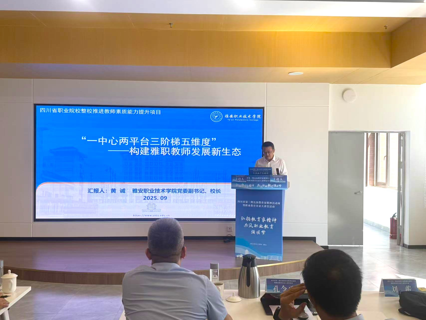 学校党委副书记、校长黄诚作为建设项目负责人,代表学校以《一中心两平台三阶梯五维度——构建雅职教师发展新生态》为题在案例分享环节作经验交流。他聚焦系统性设计、协同性建设、创新性赋能、组织保障等内容,充分展示了我校在教师队伍建设方面的前瞻性思考和体系化实践,为与会者提供了可借鉴、可操作的雅职经验,彰显了我校在推动职业教育教师队伍高质量发展方面的探索与担当。