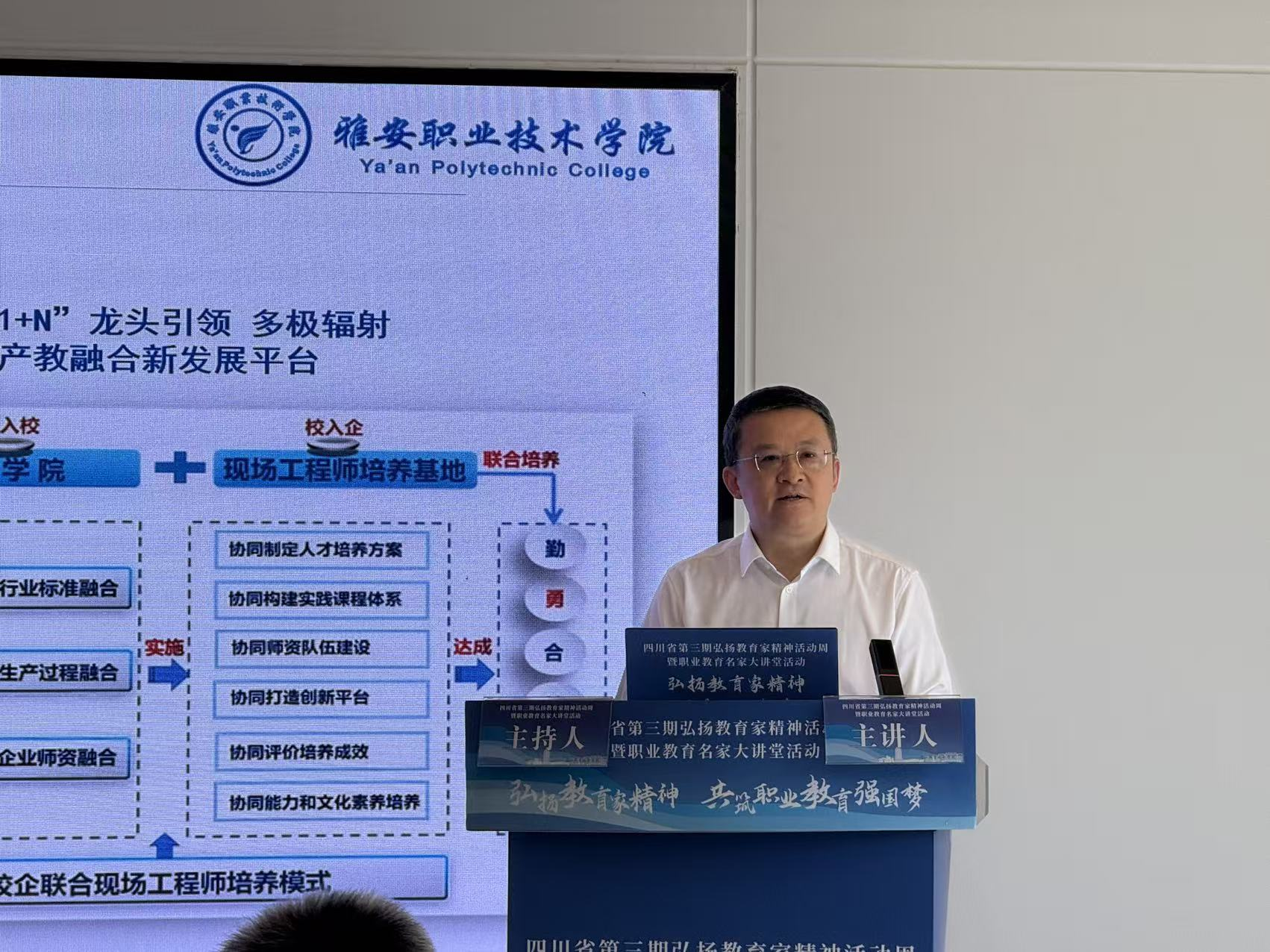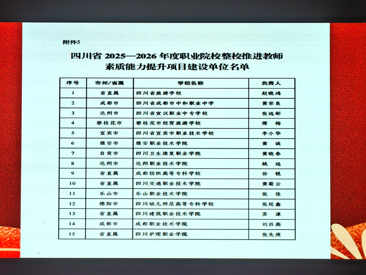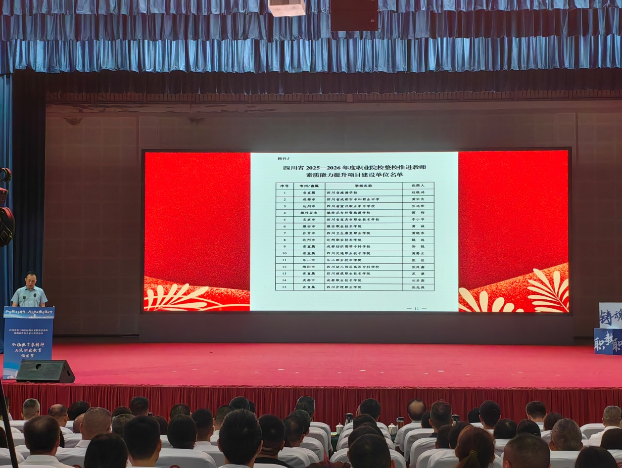 9月15日,在四川省教育厅指导下,由四川省教师发展中心与四川省教育融媒体中心(四川教育电视台)共同举办的第三期弘扬教育家精神活动周暨职业教育名家大讲堂活动在眉山职业技术学院举行。活动以“弘扬教育家精神 共筑职业教育强国梦”为主题,汇聚省内外职业教育名师名家代表,通过教育名家大讲堂、案例分享、专家引领等多种方式,深度解码教育家精神的时代价值与实践路径,为教育强省建设注入强劲动能。会议启动仪式上,公布了四川省2025—2026年度职业院校整校推进教师素质能力提升项目建设单位名单,学校成功入选其中。