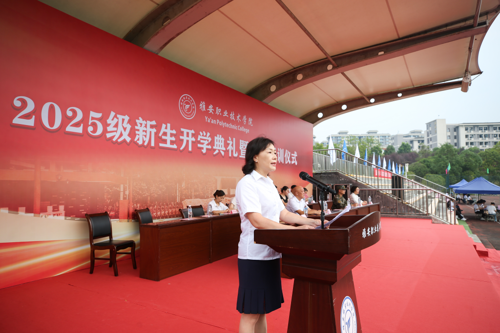 杨洪媛、樊先茂以《浴火重生铭青史 薪火相传启新程——纪念中国人民抗日战争暨世界反法西斯战争胜利80周年》为题开讲“开学第一课”,希望同学们以军训为起点,继承和发扬伟大抗战精神,以军人的标准严格要求自己,训出斗志,练出本领,以优异的军训成绩和昂扬的精神风貌,开启精彩的大学生涯,在未来技能报国的广阔舞台上,书写无愧于时代、无愧于历史的青春华章。并代表学校向全体新生寄予三点期许:一是铭记历史,在缅怀先烈中汲取奋进力量,筑牢爱国之魂;二是立足当下,在军训磨砺中锤炼过硬作风,夯实成才之基;三是展望未来,在技能报国中彰显青春价值,成就出彩人生。