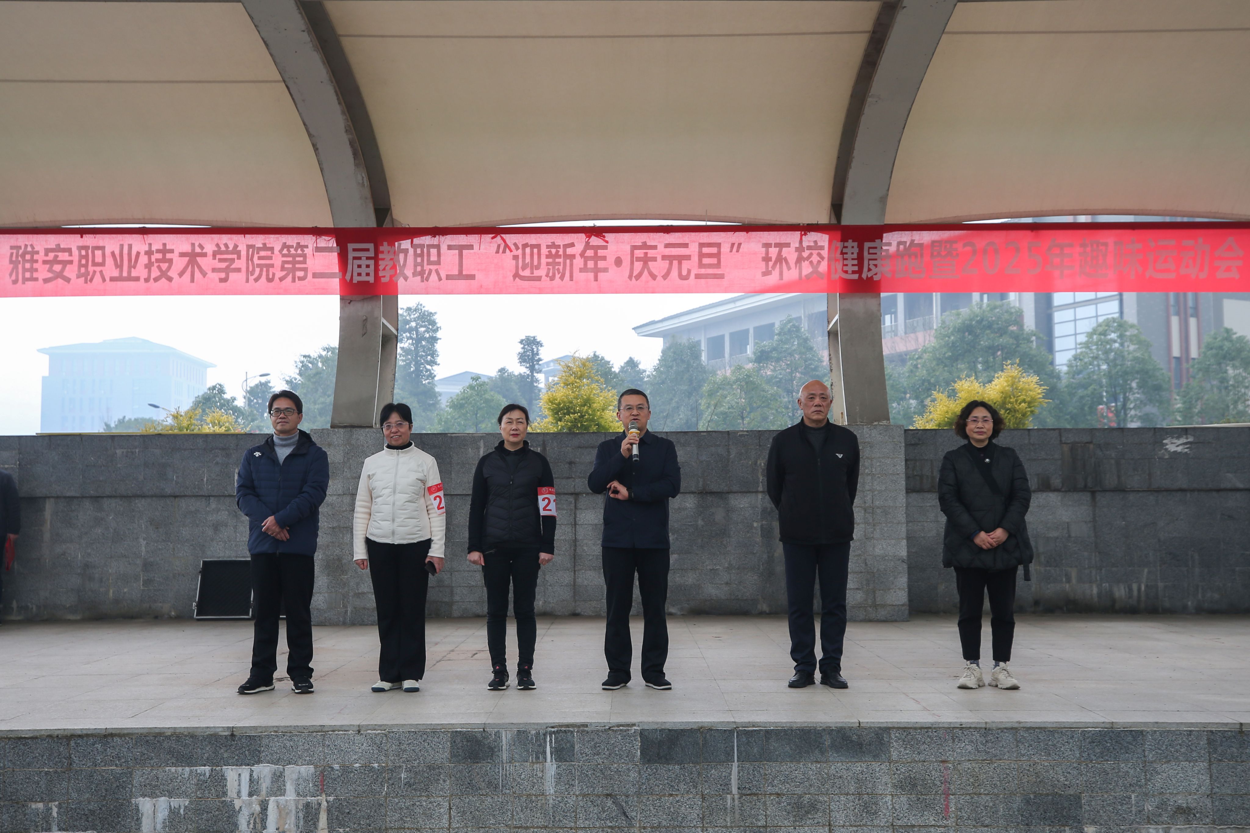 在2026年元旦即将来临之际,学校工会于12月30日下午,在经开区校区举行第二届“迎新年·庆元旦”环校健康跑暨教职工趣味运动会。学校党委副书记、校长黄诚,党委副书记杨洪媛,党委常委、副校长樊正康、陈冬冬和副校长彭裕红出席开幕式。党委常委、工会主席夏安琼致开幕辞。