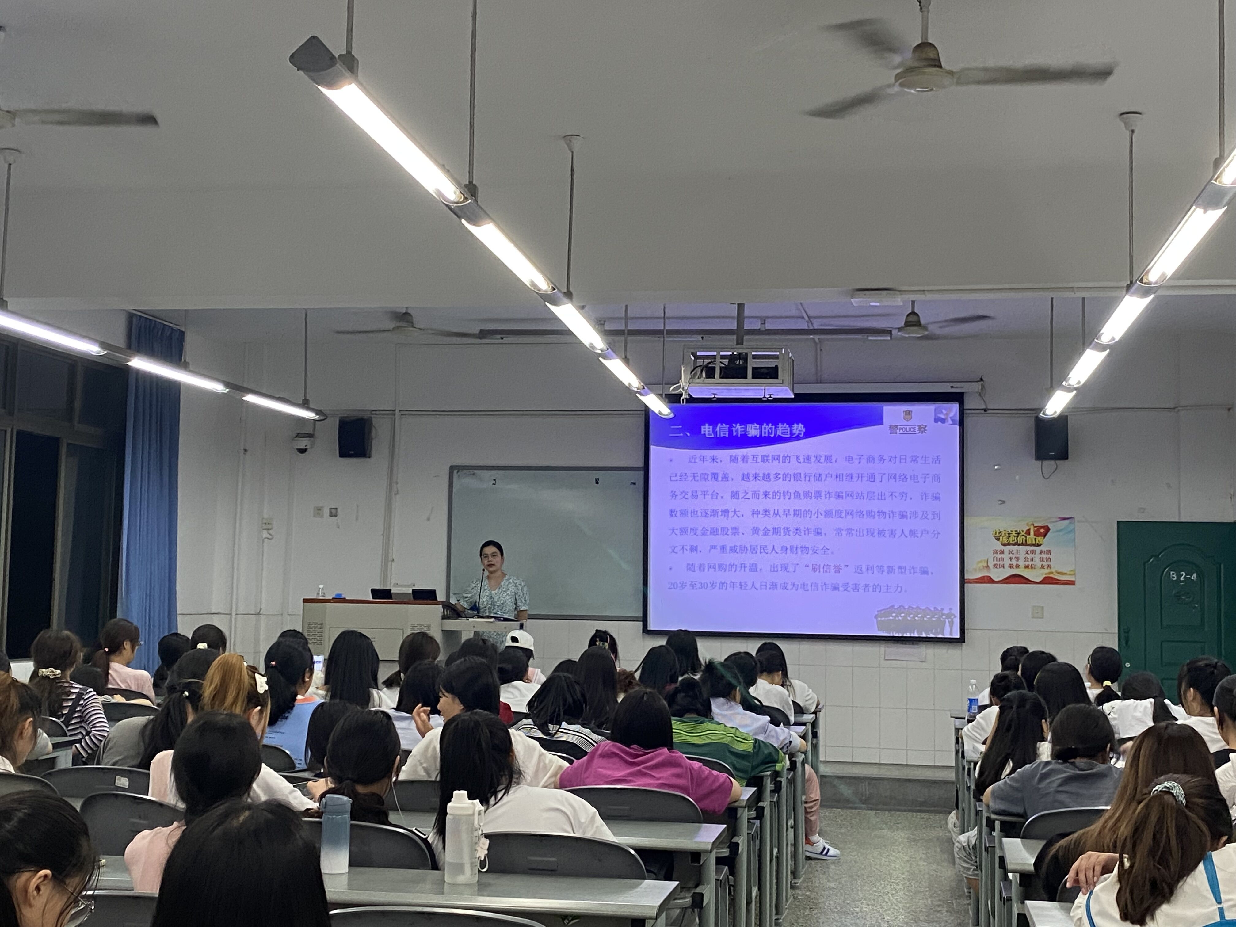 在主题教育活动中,以PPT的形式、结合相关真实案例分别向参与本次主题教育活动的学生讲解什么是电信诈骗、电信诈骗的形式,新型电信诈骗犯罪的严重危害性。其中在解释电信诈骗中重点向同学们介绍了不法分子主要通过电话、网络和短信方式,编造虚假信息,对受害人实施 远程、非接触式诈骗,诱使受害人给犯罪分子打款或转账的犯罪行为。