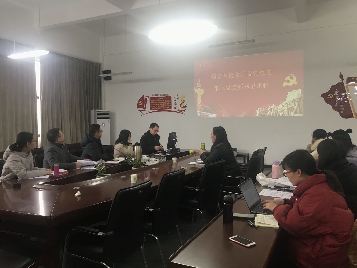 1月4日中午,药学与检验学院党总支召开了2021年度党支部书记抓党建工作述职评议会。