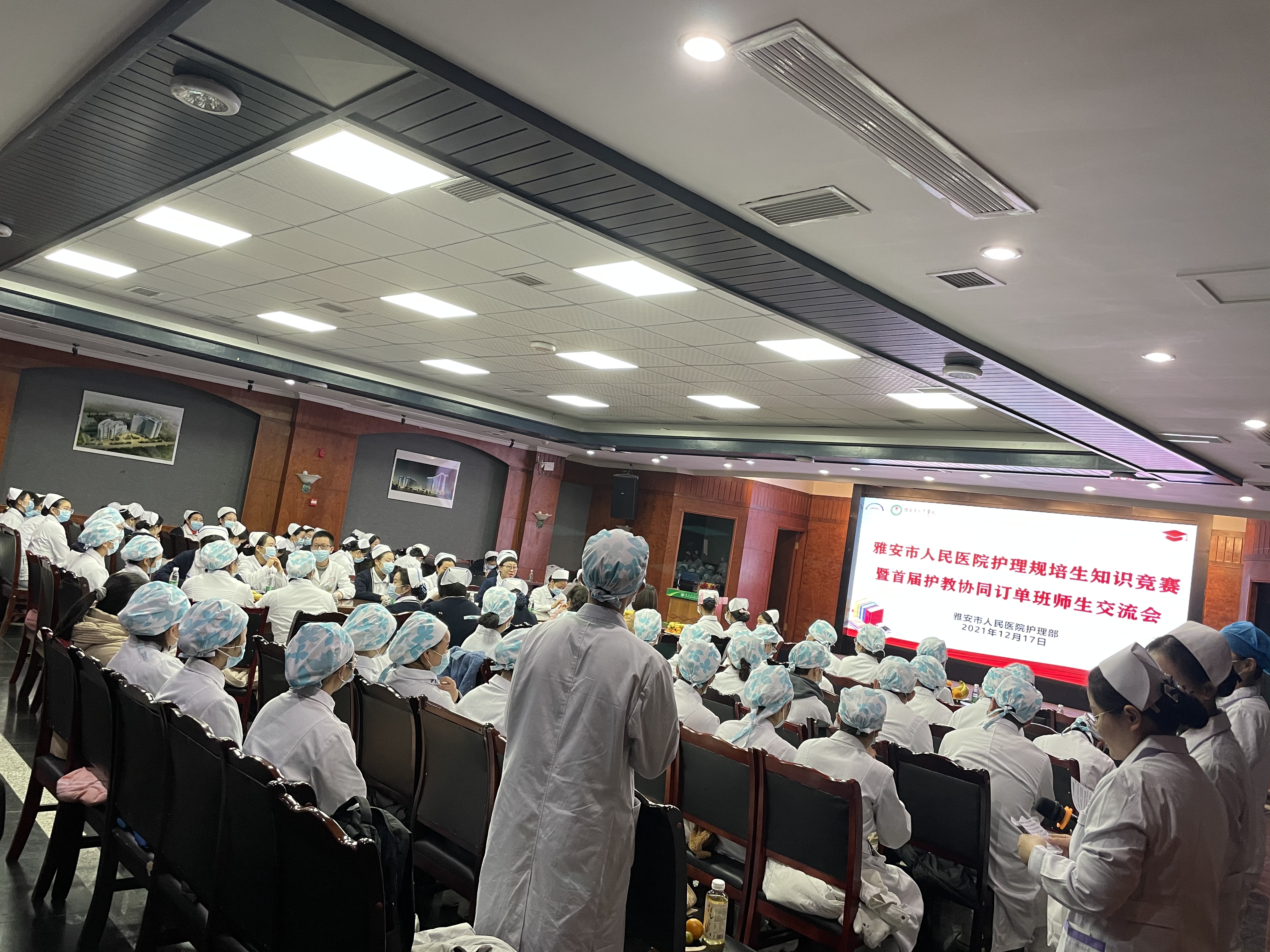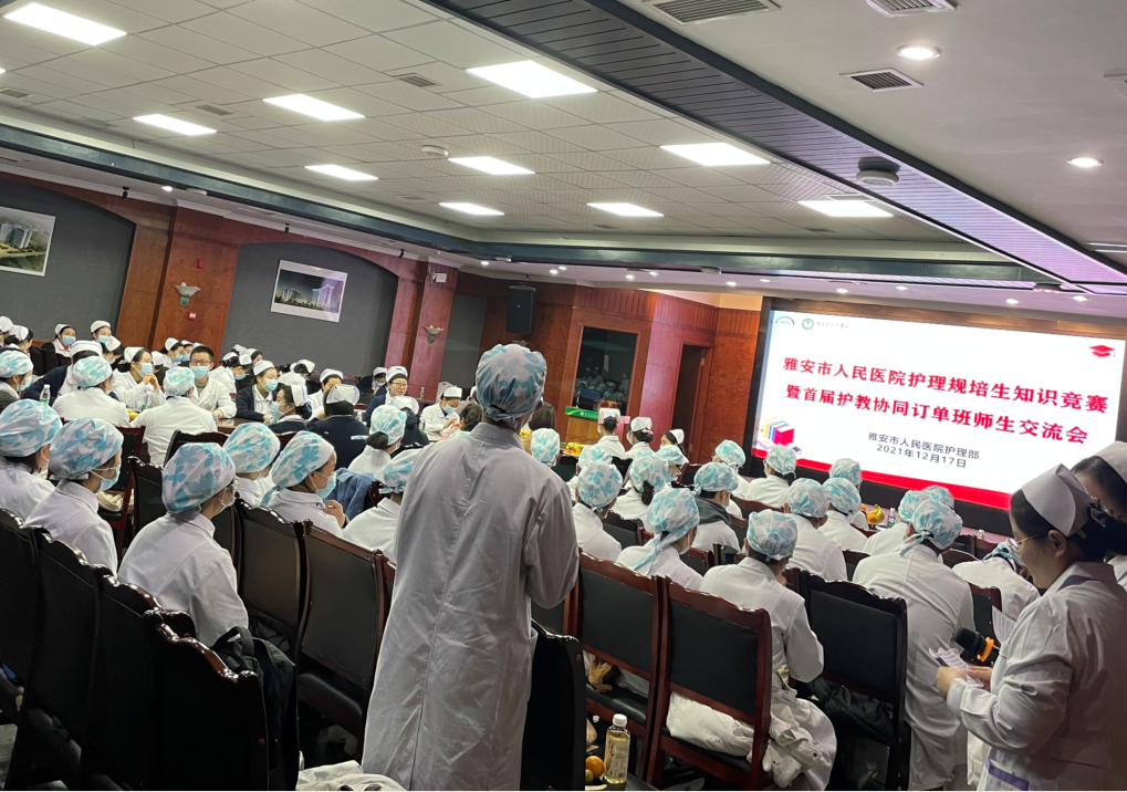 12月17日下午,雅安市人民医院护理规培生知识竞赛暨首届订单班师生交流会在雅安市人民医院学术报告厅举行。雅安市人民医院护理部主任胡盛琳、副主任周昀霞,呼吸与危重症学科、血液科、肾脏风湿免疫科、心血管内科等科室的带教老师,护理学院副院长李婧,教研室主任陈俊,以及规培生和订单班全体同学参加开班仪式。