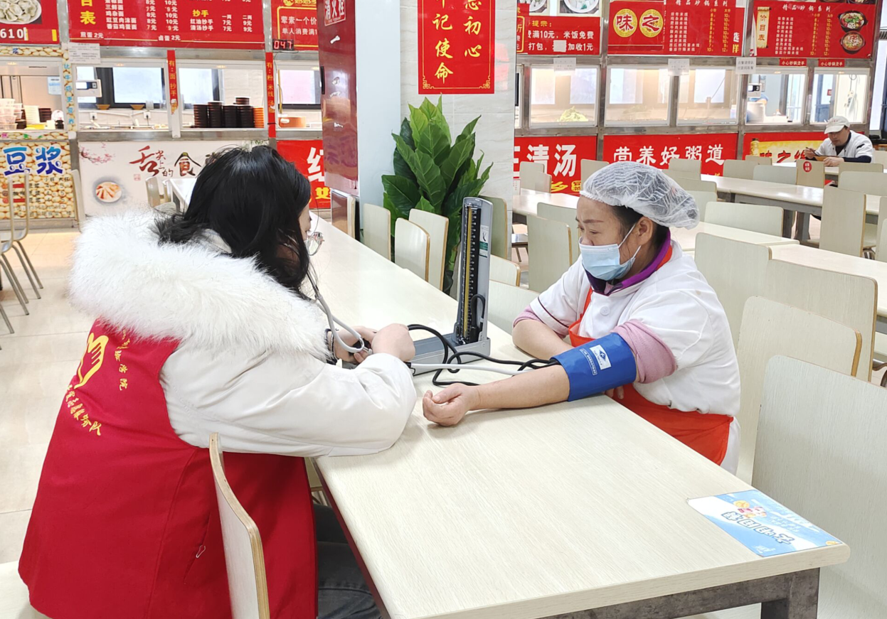 12名身穿红色马甲的志愿者分为3组,在食堂、门卫室、宿管中心等多个地方为后勤保障工作人员测量了血压,宣传了高血压病的相关知识,同时对后勤人员提出的高血压的危害性以及如何预防高血压等问题进行了一一解答。