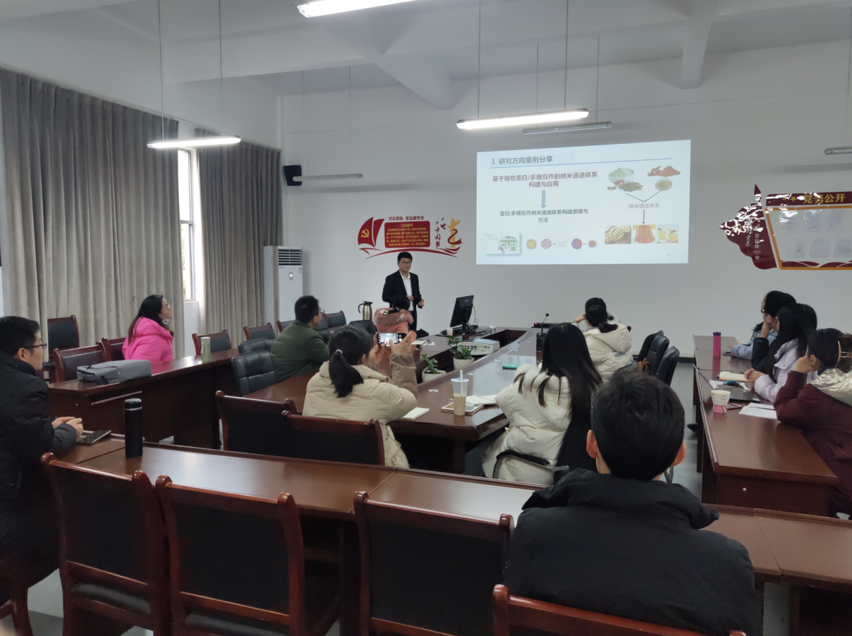 报告中,张清介绍了自己目前正在从事的“植物蛋白/多糖互作的纳米递送体系构建与应用”领域的做法及研究成果,交流了自己在确立科研方向、组建科研团队、攻克科研难题、总结学术成果等科研工作的经验,同时分享了自己在文献查阅与管理、课题项目申报、平衡教学科研、加强对外交流等方面的心得体会。