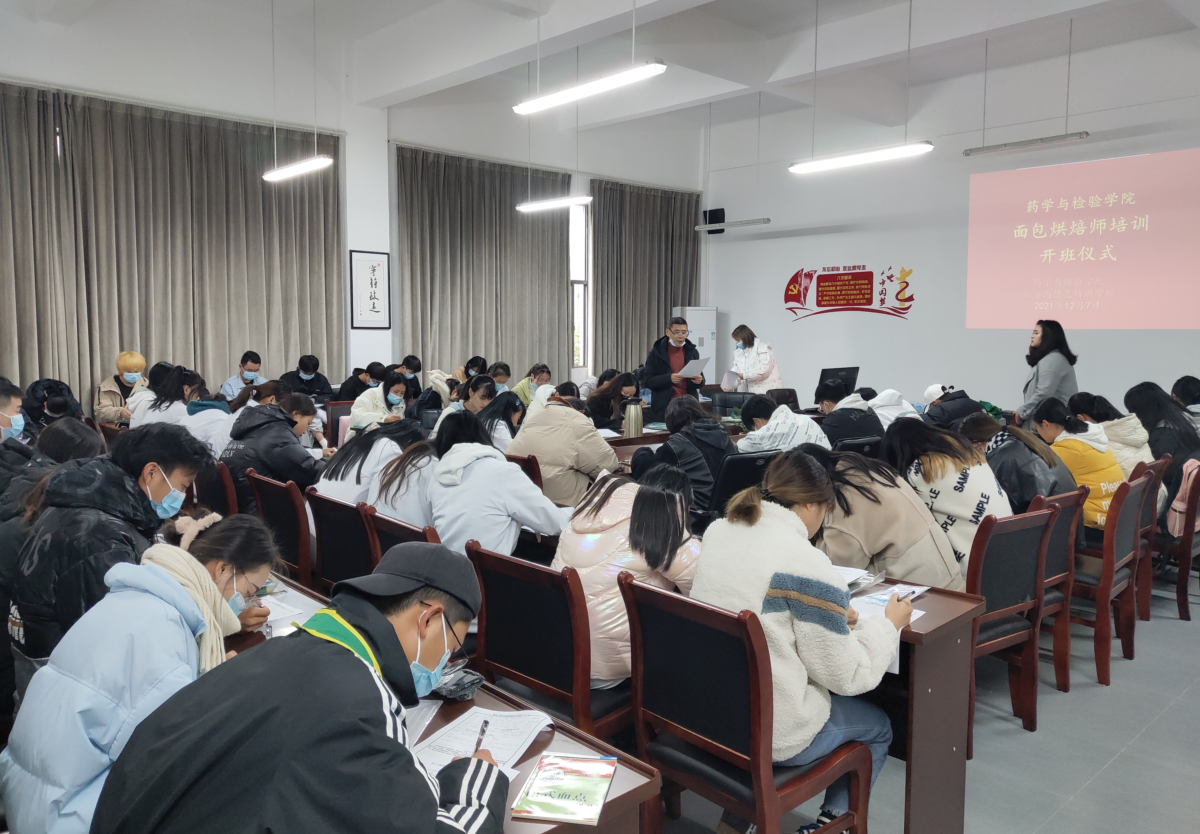 12月9日,由药学与检验学院、雅安尚德艺培训学校联合举办的面包烘焙师培训班正式开班。药检学院食品与营养学教研室杨冬雪、李杰老师、培训学校张刚老师以及培训班一班60名同学共同参与了开班仪式。