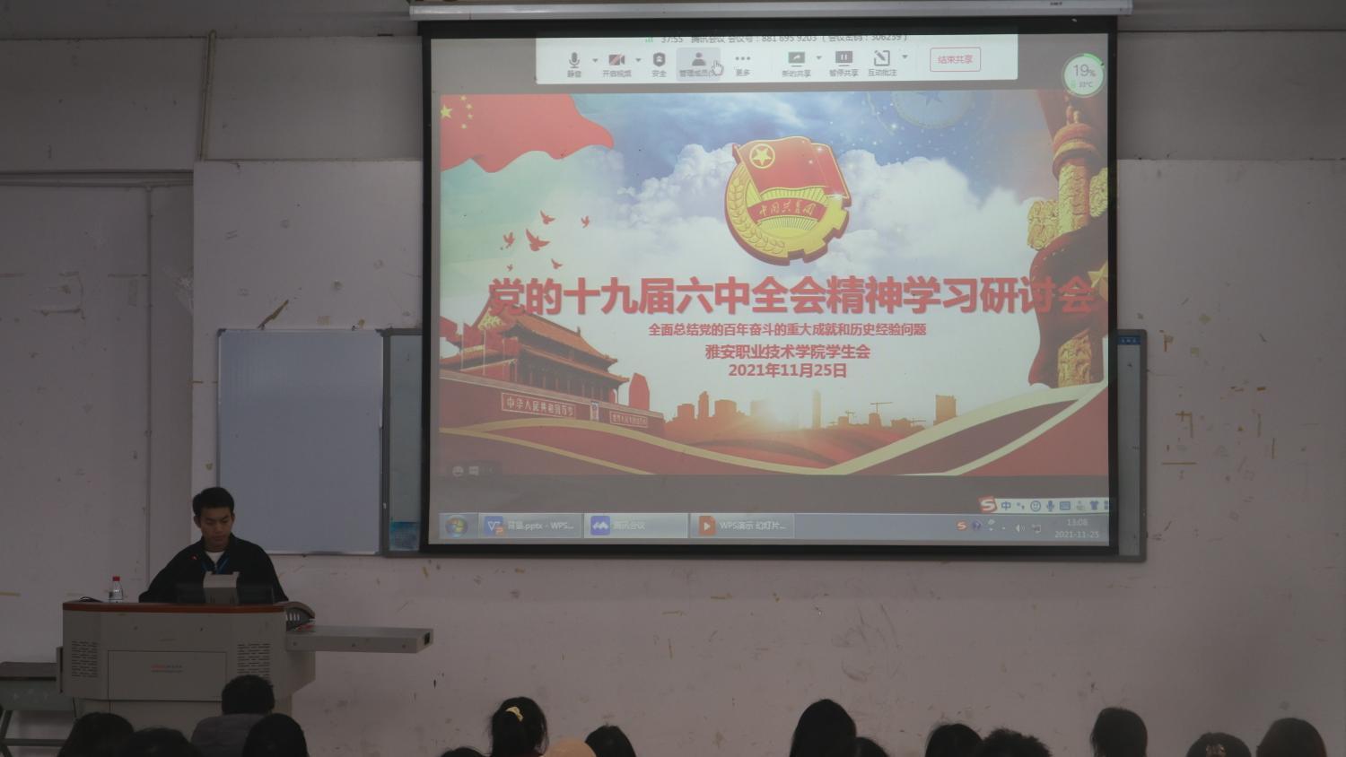 会上,学生会执行主席任良轩领学《中国共产党第十九届中央委员会第六次全体会议公报》,学生会成员结合自身学习工作及党史学习的收获和体会展开讨论与交流。