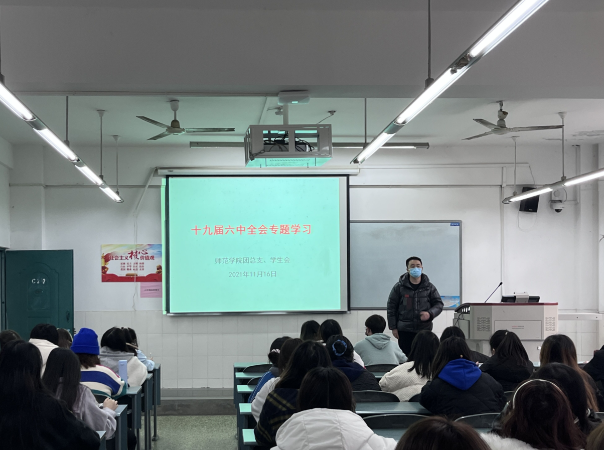 11月16日,师范学院团总支在青年路校区c202举行“十九届六中全会”专题学习会议。师范学院团总支书记蔡小龙、师范学院团总支、学生会主要干部及各班团支书参加会议。会议由蔡小龙主持。