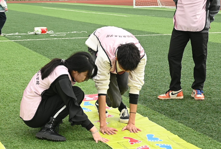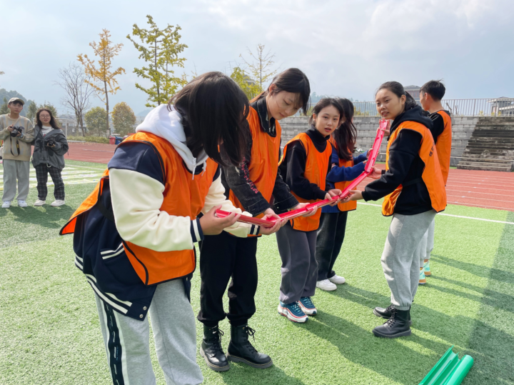 在团委副书记叶芋伶、郭庆以及团委老师的带领和主持下,各部门有序进行分组,组成3支队伍参与团建比赛。整个活动分为五个游戏环节,分别是“飞夺泸定桥”“翻越夹金山”“强渡大渡河”“巧夺金沙江”“四渡赤水”。活动中,各组成员齐心协力、默契配合,或竞逐而行,挥洒汗水;或相互鼓励,合力竞争,充分展现出雅职学子积极向上的青春风貌。场外啦啦队也纷纷为各自的队伍出谋划策、加油助威,现场氛围热烈,欢呼声、加油声、笑声响彻操场。
