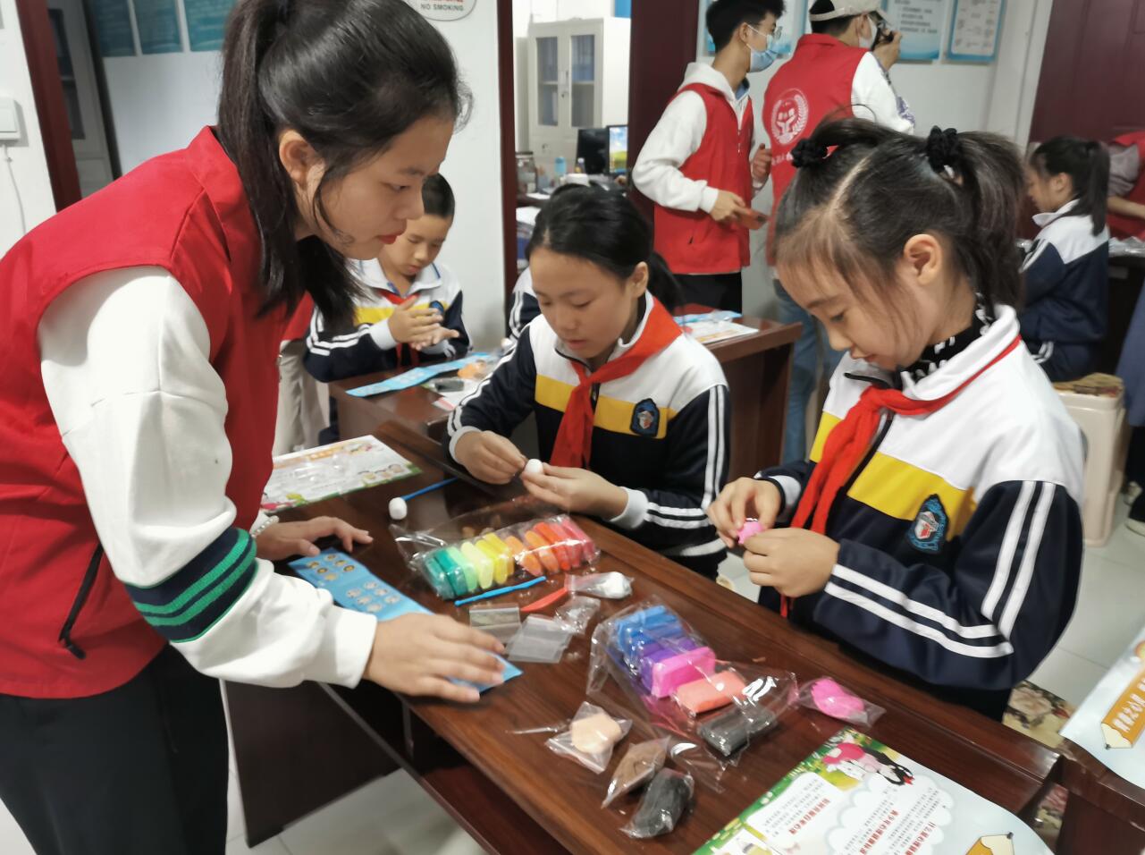 雅小青志愿者们向孩子们分发了世界精神卫生日的宣传资料;详细讲解了超轻黏土的基本性能、制作规律和工具的使用方法,鼓励孩子们发挥想象力大胆创作。活动中孩子们热情高涨,积极参与,活动现场到处洋溢着孩子们的欢声笑语和欢乐气氛。
