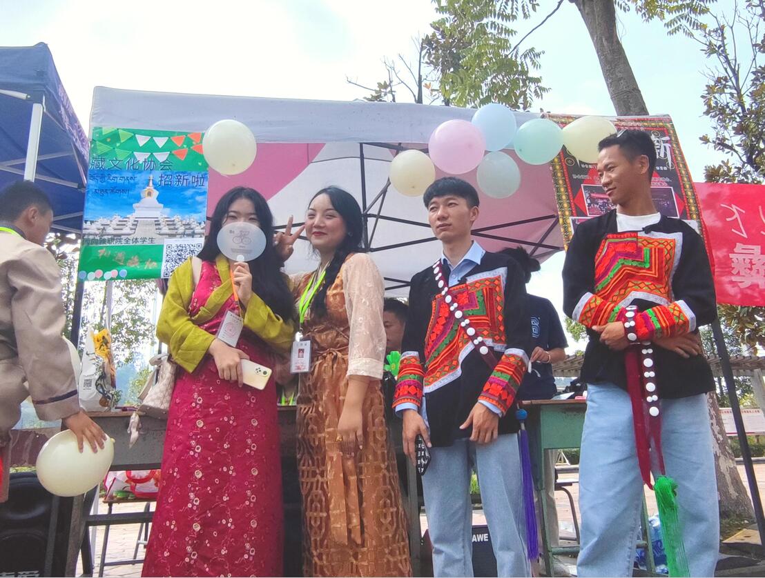 招新当天一早,各社团负责人陆续进入指定位置,为招新工作做准备。此次招新,共31个社团包括文化体育类、文学科学类、志愿公益类、创新创业类等。招新过程中,社团成员们除了通过张贴海报和横幅等进行宣传,还都拿出了自身的看家绝活,竭力展示本社团的文化和特色活动。尤其是彝文化协会和藏文化协会,同学们身着民族服装,唱着民族歌曲展现本民族的特色文化,吸引了众多同学的注意。