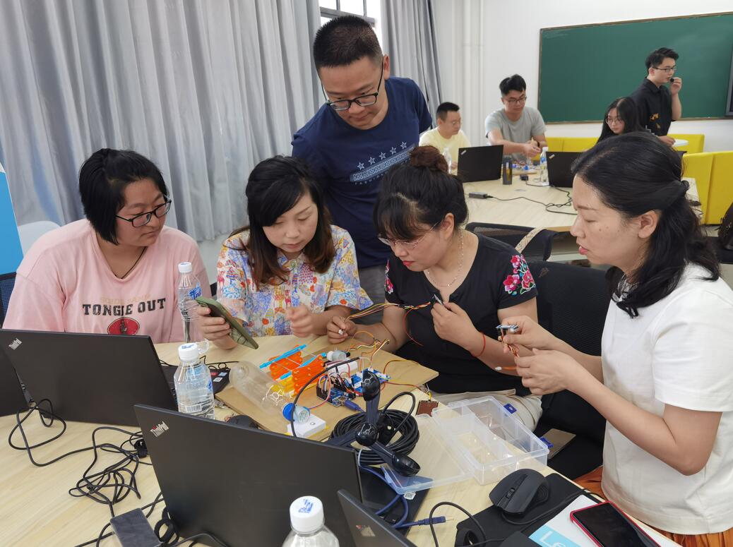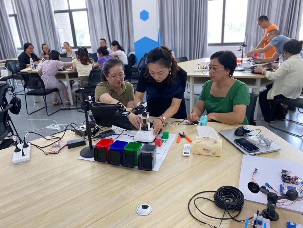 本次培训以实战课程为主,培训内容丰富实用,包括大数据可视化大屏制作、人工智能、物联网、智能物品分拣系统等前沿知识。企业培训导师生动形象地讲解与示范,采用学生获奖作品作为案例,体现了以创促教、反哺教学的生动实践。参训教师的积极性很高,认真汲取数智化改造知识,畅聊大数掘与人工智能带来的对教师、教材、教法的改革。