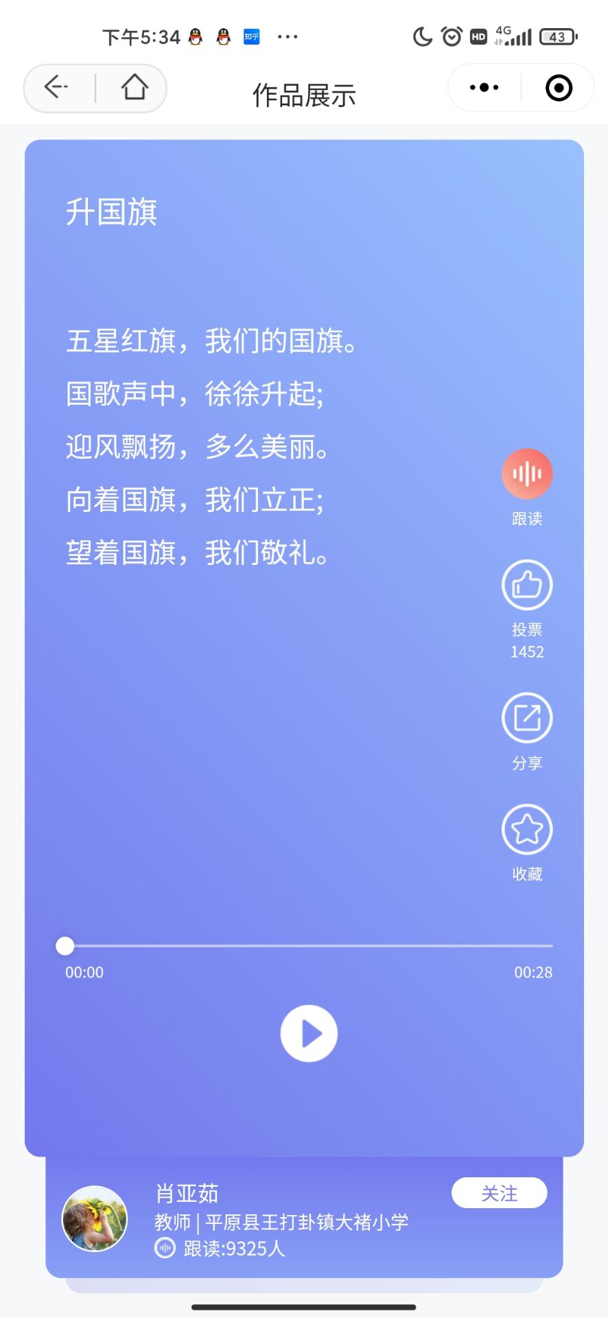 此次“全国青少年诵读党史故事”活动以“红色基因代代传”为主题。学生跟读了为人民服务、王小二、七律·长征、升国旗、邓小平爷爷植树、雷锋叔叔你在哪里、吃水不忘挖井人、难忘的泼水节等作品,通过诵读党史故事,学生进一步了解党的光辉历史,从党的百年历程中传承红色基因,坚定了听党话、感党恩、跟党走的决心。