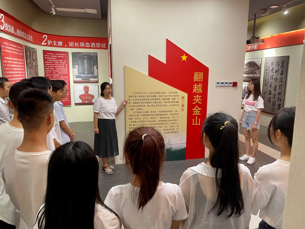 药检学院校友周郭昂带领大家参观教育基地,并给同学们讲述了中国共产党建设的艰难历程。鲜敏给同学们详细讲述了胡长保保护主席血洒荥经,陈云出川等英雄的光荣事迹,期间鲜老师也多次提出问题,大家积极参与问答互动。通过教育基地生动的图像和老师的讲解,进一步加深深了青年团员对党史的认识,让大家从百年伟大奋斗历程中汲取前行的力量和智慧。