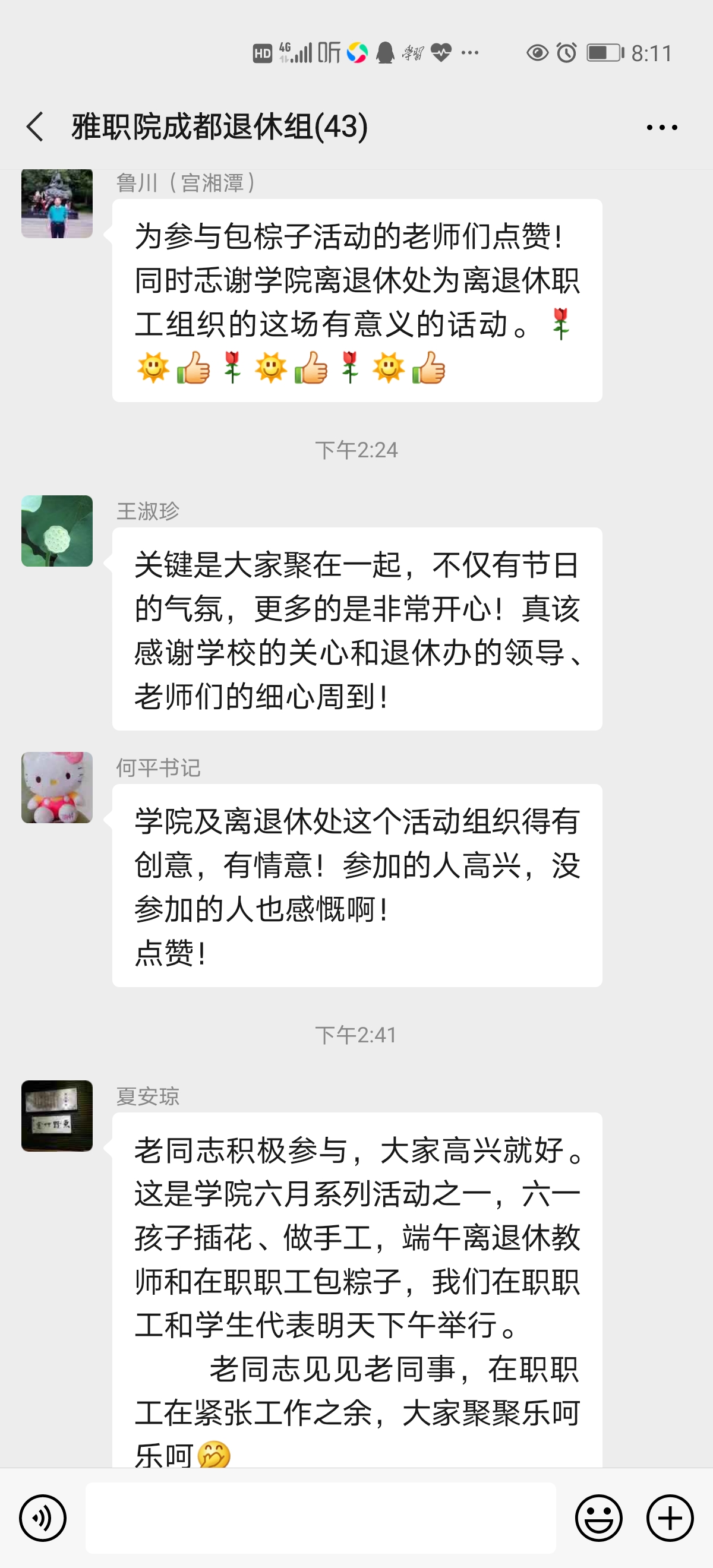 活动结束后,离退休人员工作处还将包好的粽子送到92岁的离休干部、老党员王勤管家里,恭祝老同志端午安康。离退休教职工也纷纷在微信群里分享活动照片、活动体会,并感谢学院组织这次活动,让他们老有所乐、老有所为。