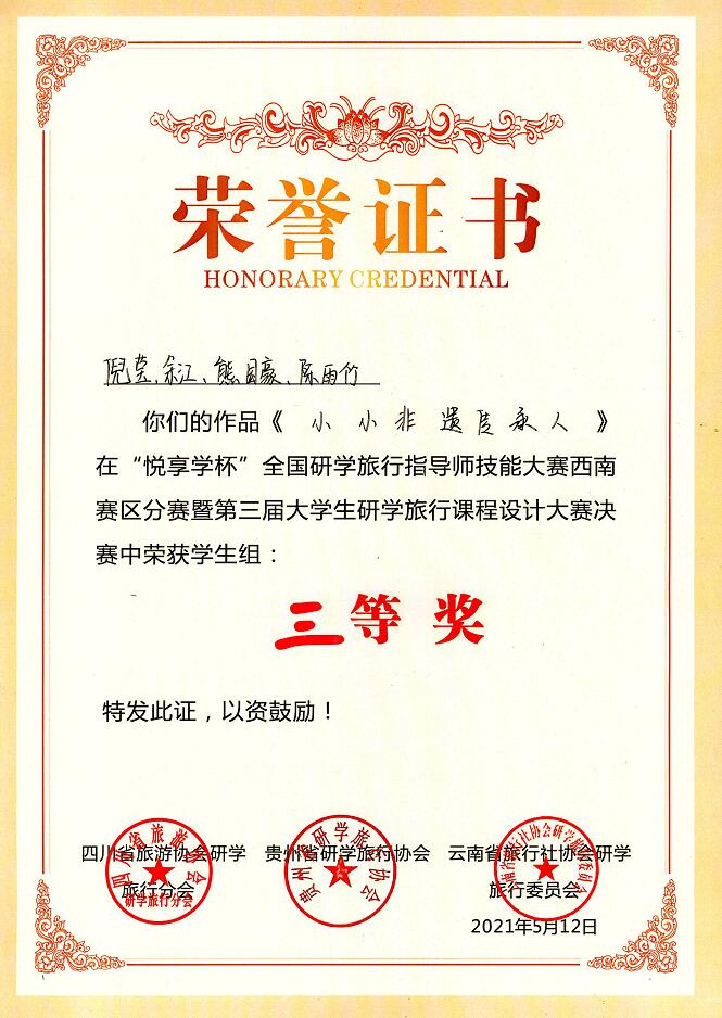 本次大赛来自云贵川渝等西南省市的12名行业组选手和30支高校学生团队以及西南区域行业协会、研学旅行企业近300人参加。经济与管理学院4名学生作为学院代表参加了此次决赛。大赛活动历经作品设计、提交、初审、初赛结果公示、网络投票、现场决赛等阶段,最后通过决赛现场展示评选,旅游管理专业学生余江、熊国豪、陈雨竹、倪莹以设计的研学课程“小小非遗传承人”荣获三等奖。